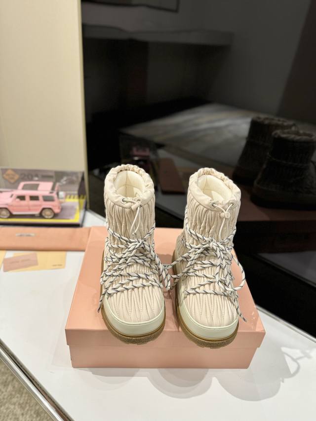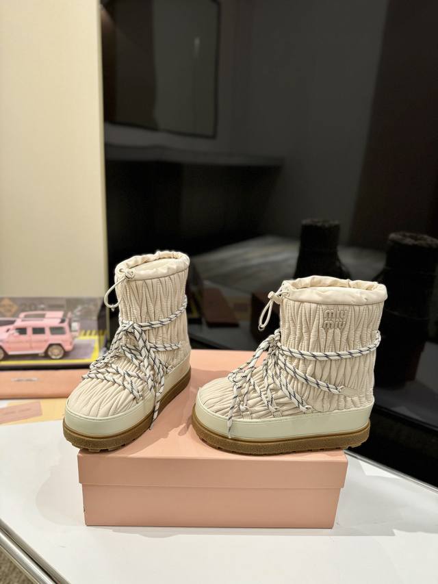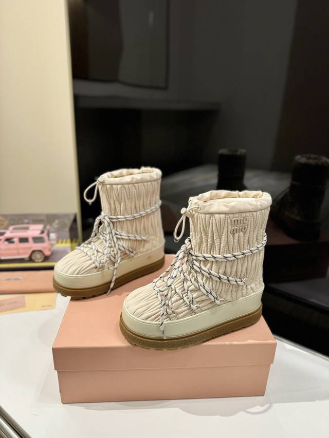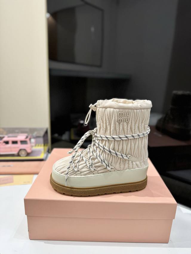 出厂价Pp: 雪地短靴 Miumiu缪缪最新系列,女士徽标尼龙华达呢雪地派对金属标双色厚底收缩系带羽绒雪地靴滑雪靴胖头靴! 有轻奢的内蕴品质,自带温暖的腔调,材穿着舒服,爱不释手,高颜值高品质防水防滑巨保暖,Logo侧标鞋面系带可调节松紧 这个冬天爱了! 面料:进口原版毛绒 内里:加厚加棉毛绒 大底:独家开模Tpu大底 码数:35-40 41 42定制不退换 包装:全套原版包装