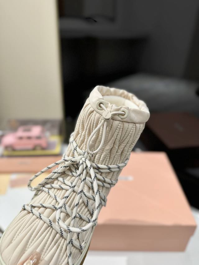出厂价Pp: 雪地短靴 Miumiu缪缪最新系列,女士徽标尼龙华达呢雪地派对金属标双色厚底收缩系带羽绒雪地靴滑雪靴胖头靴! 有轻奢的内蕴品质,自带温暖的腔调,材