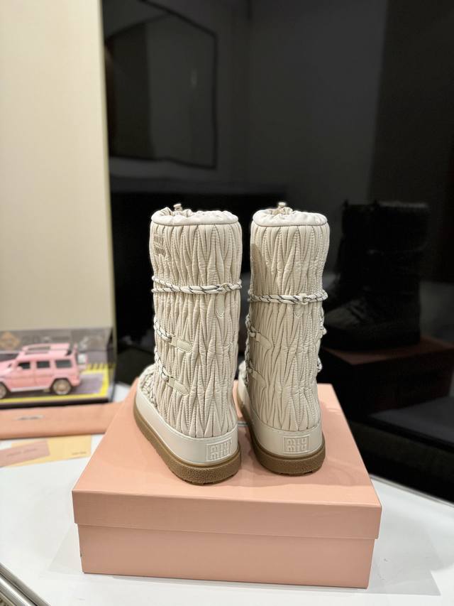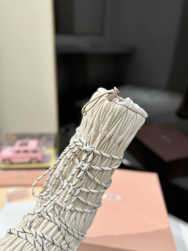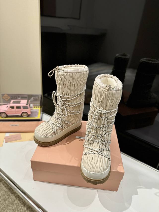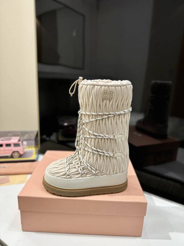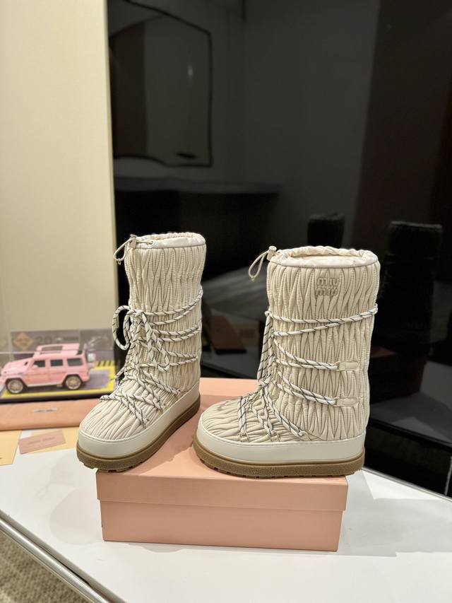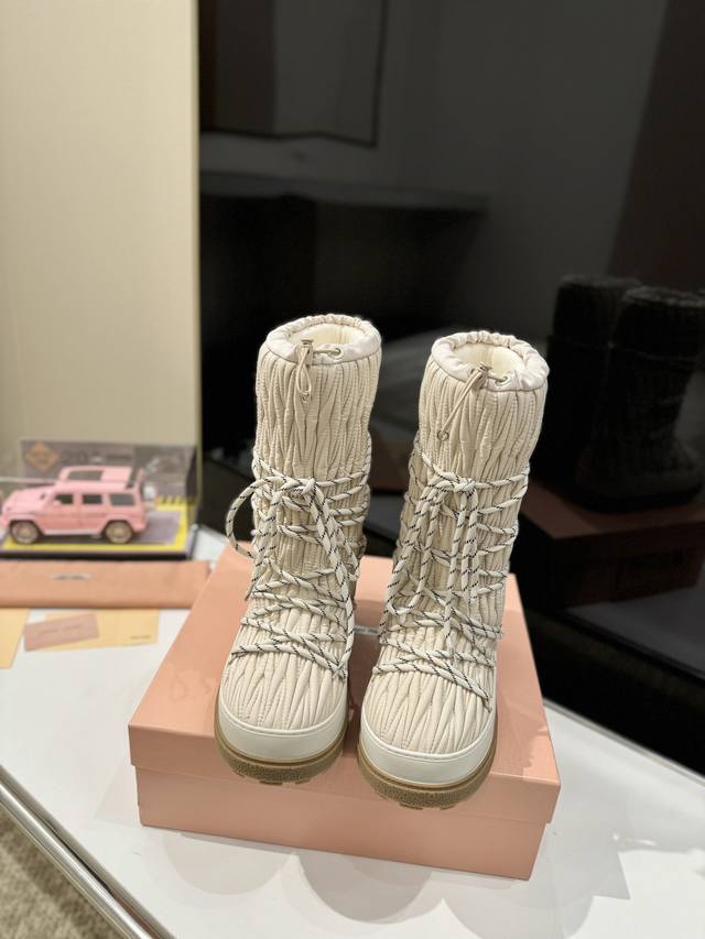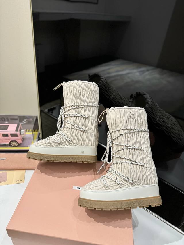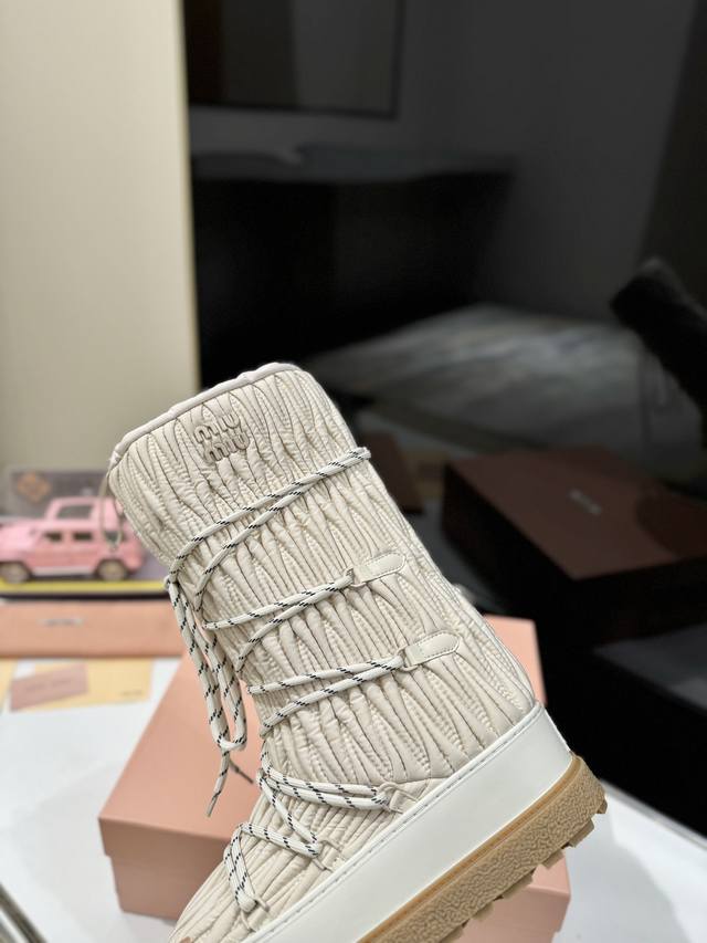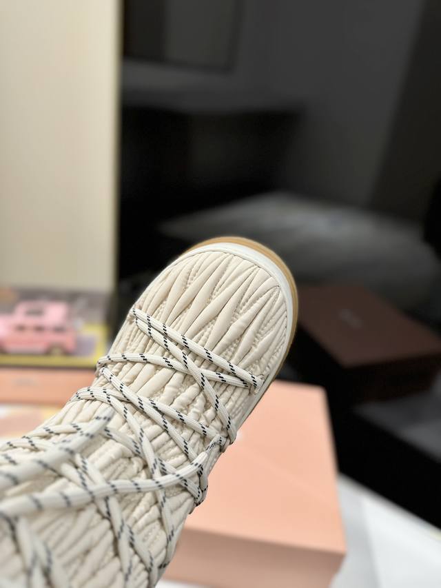 出厂价Pp: 雪地长靴 Miumiu缪缪最新系列,女士徽标尼龙华达呢雪地派对金属标双色厚底收缩系带羽绒雪地靴滑雪靴胖头靴! 有轻奢的内蕴品质,自带温暖的腔调,材