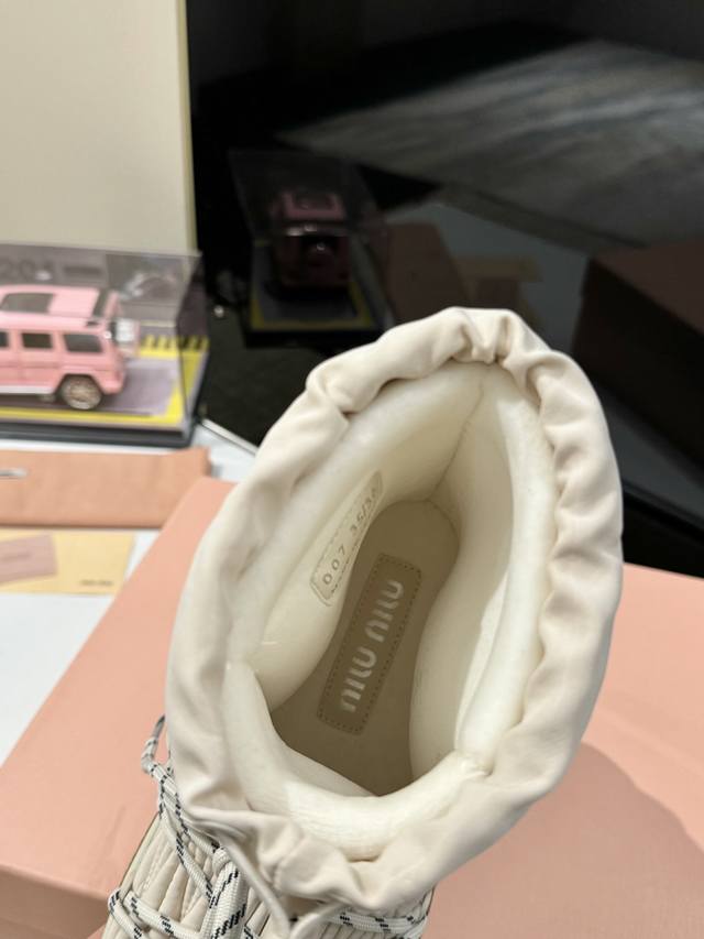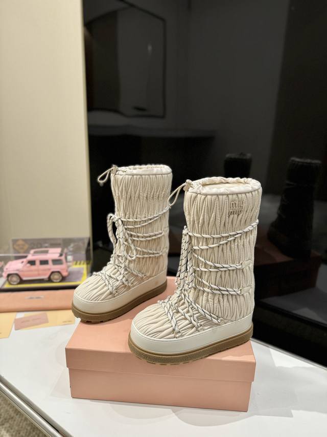出厂价Pp: 雪地长靴 Miumiu缪缪最新系列,女士徽标尼龙华达呢雪地派对金属标双色厚底收缩系带羽绒雪地靴滑雪靴胖头靴! 有轻奢的内蕴品质,自带温暖的腔调,材穿着舒服,爱不释手,高颜值高品质防水防滑巨保暖,Logo侧标鞋面系带可调节松紧 这个冬天爱了! 面料:进口原版毛绒 内里:加厚加棉毛绒 大底:独家开模Tpu大底 码数:35-40 41 42定制不退换 包装:全套原版包装