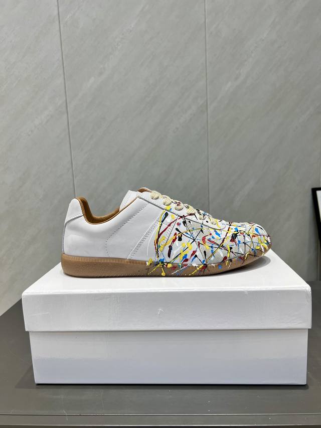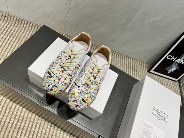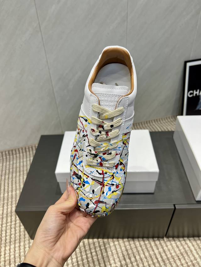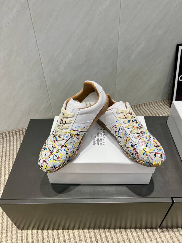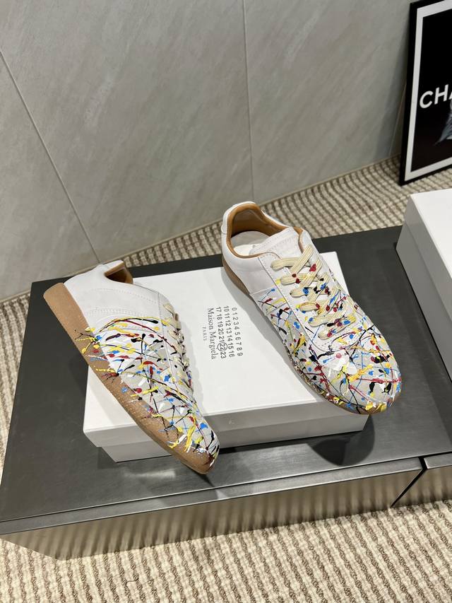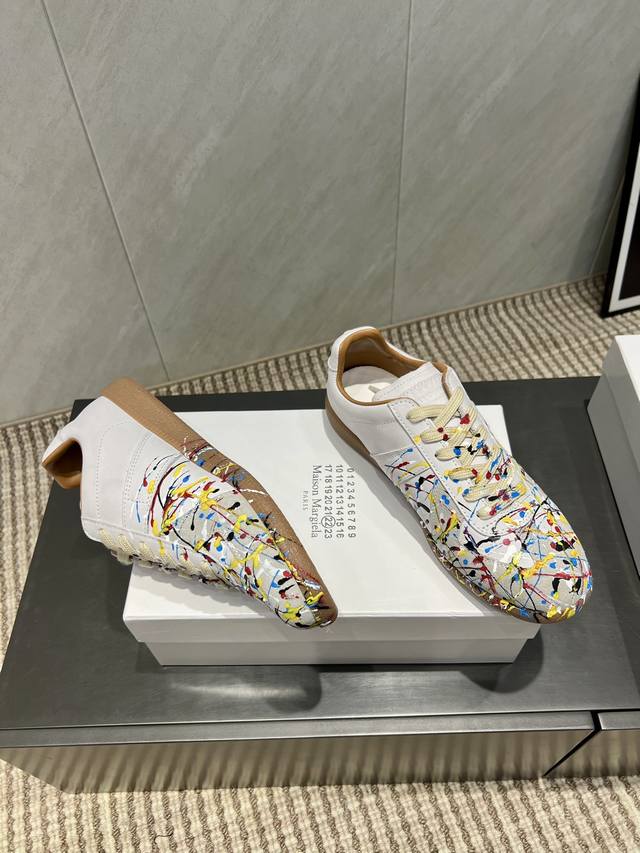 出厂:情侣 独家顶级版本 M*M6M*Aison M*Argiela~25Vs秋季经典复古休闲系列 复古涂鸦休闲鞋 光听到复古风就能立刻想到经典M*Arginal,复古时髦,春夏秋冬配色干净清爽集合,舒适,酷飒,休闲于一体的风格设计,很马吉拉风格,上脚无压力十足先锋元素,原版包装 一个轻奢潮款多元素结合玛吉拉设计师设计这一款德国训练鞋延续了经典的T形真皮拼接,经过设计团队多次的精心改良,只为让您体验最原始的军旅味道~设计师设计工艺:结合运动休闲拉邦套楦顶级工艺,不脱底,不臭胶水,采用拉邦套楦工艺 面料:原