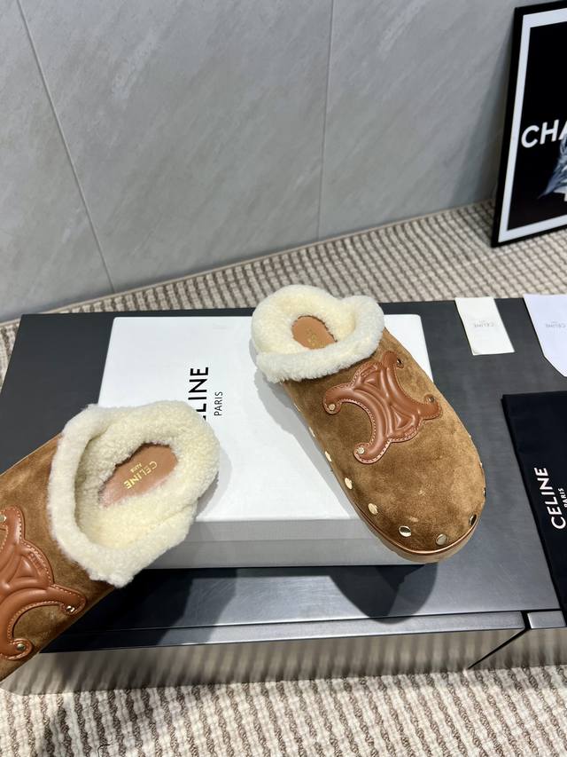 / 出厂: 独家顶级版本 C*Eline赛*琳2025Vs秋季最新爆款毛拖系列 圆头柳钉厚底毛拖 官网同步最新款,专柜最高版本顶级品质,毛茸茸的时髦感十足,舒适的圆