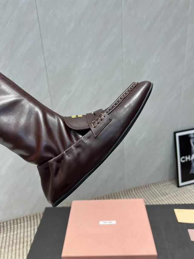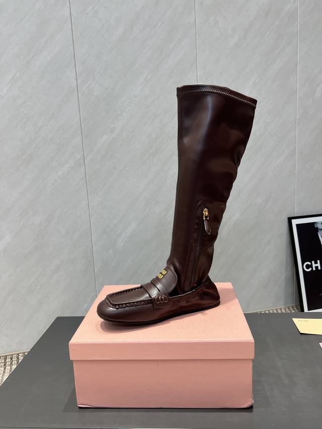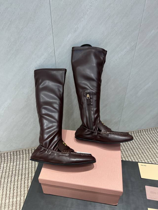 出厂: 独家顶级版本 Miumiu缪缪2025Vs秋冬最新走秀爆款靴子系列 复古方圆头弹力高靴 顶级版本Miumi秋冬限量走秀款长筒靴! 今年最值得入手的靴子 没有之一!易梦玲同款超多网红明星上脚 Miumi今年秋冬确实泰酷辣 秋冬限定款 专柜非常难买 看着很硬的样子 其实非常软巨好穿!脚感超赞! 靴筒宽大 不管腿粗腿细 都能穿出宽松感而且非常显腿直!!朋克风十足! 鞋面:原版定制牛皮弹力皮革 内里:原版定制羊皮 垫脚:原版定制羊皮 大底:原版开模耐磨大底 跟高:1.0Cm 码数:35-39 40.订做不