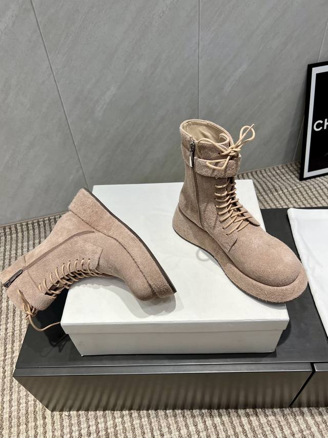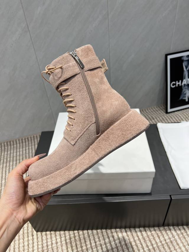 出厂: 独家顶级版本 The Row2025Vs早秋最新休闲爆款靴子系列 圆头厚底绑带短靴 原版一比一开模复刻,超级百搭好看,刘雯同款,点赞无数,原版版型,脚感非常舒适,非常好穿,简约前拉链设计,大气不平凡 鞋面:原版定制牛猄 内里:原版定制羊皮 垫脚:原版定制羊皮 大底:开模开模水台组合底 包装:原版全套包装 码数:35-39 40.41定制不退换 颜色:官方同步更新
