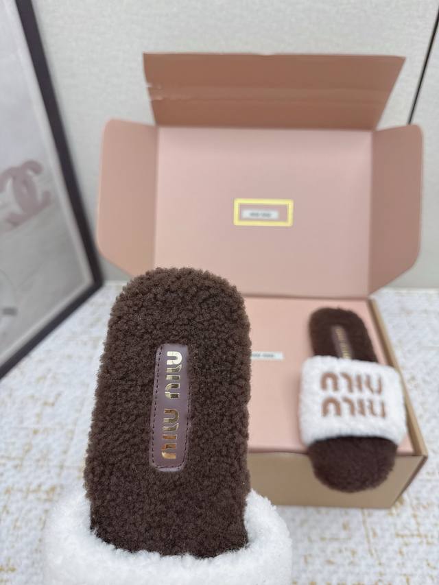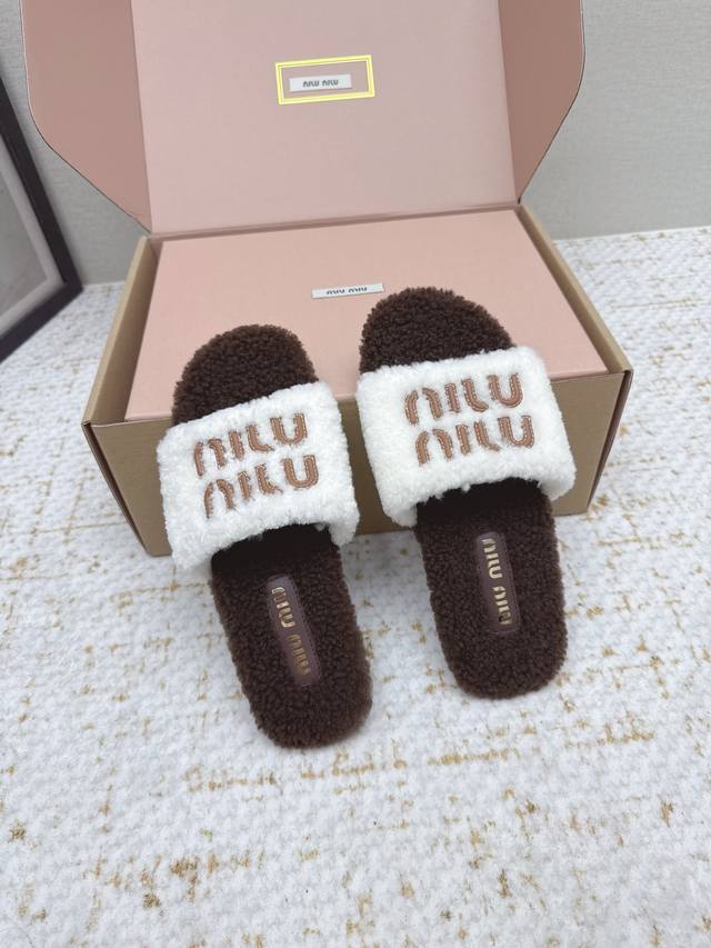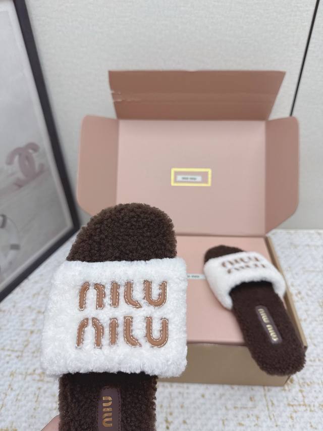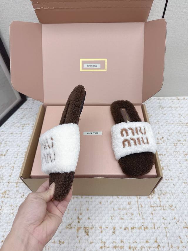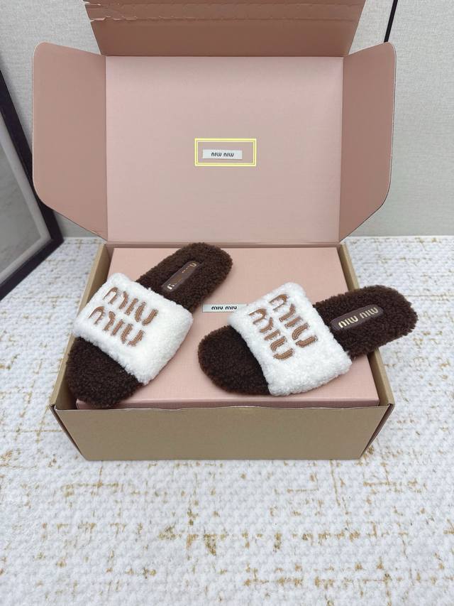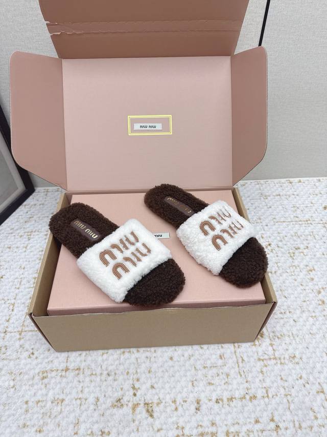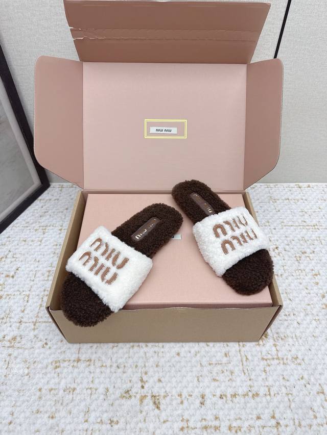出厂 高版本 Miumiu 平底毛毛拖鞋,毛茸茸材质裹着脚超暖和,软乎乎的踩感像踩云朵,完全不磨脚。 简约设计不挑风格,日常穿既显精致,又能轻松提升穿搭氛围感。
