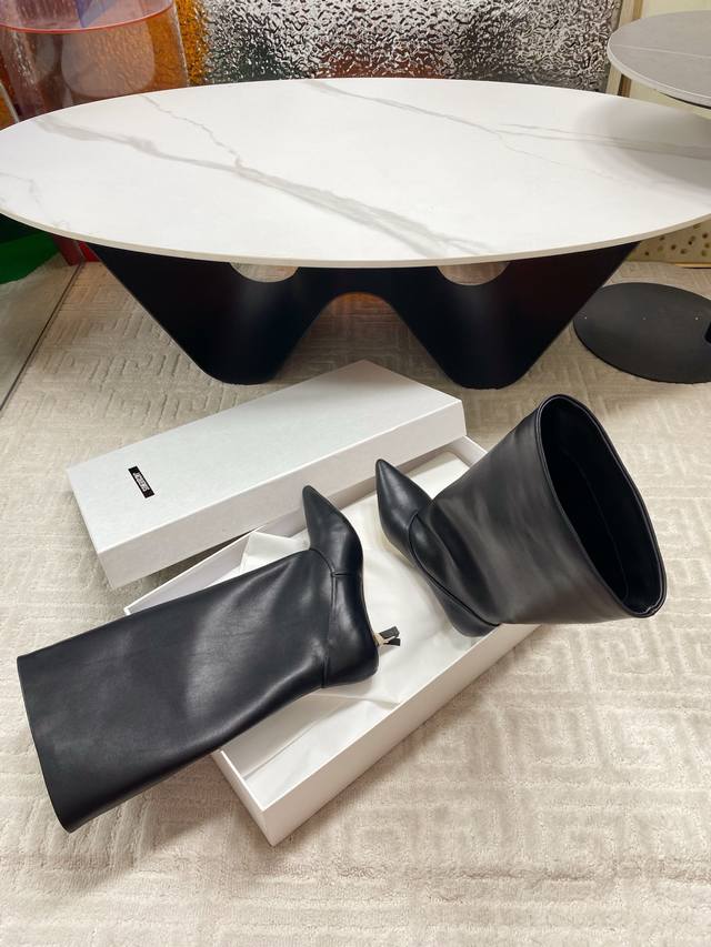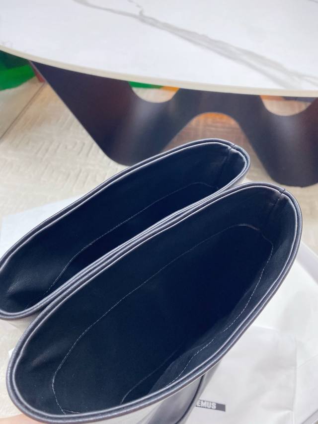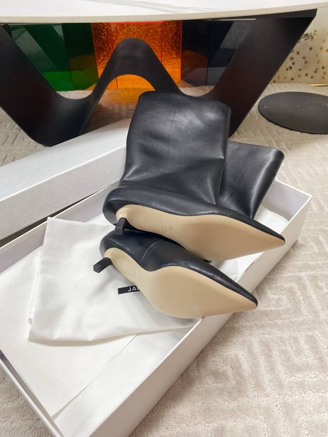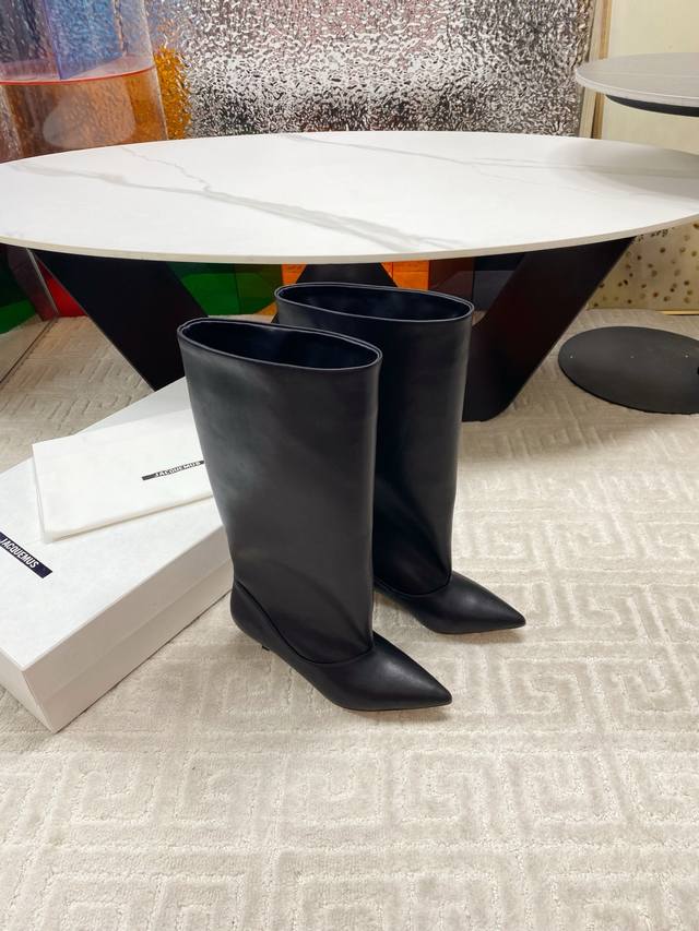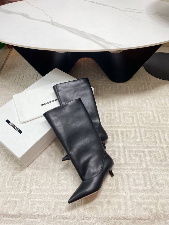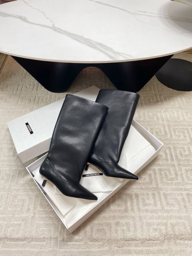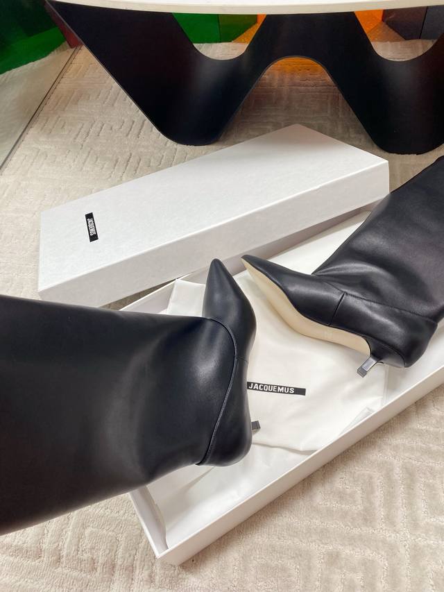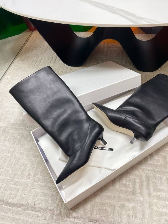 / 出厂 Jacquemus 新品靴 黑色长靴界的“时髦尖子生” 利落尖头+小猫跟 大靴筒太鲨我 气场直接拉满 走哪都是焦点~ 鞋面:进口麂皮.牛皮 垫脚:进口小羊