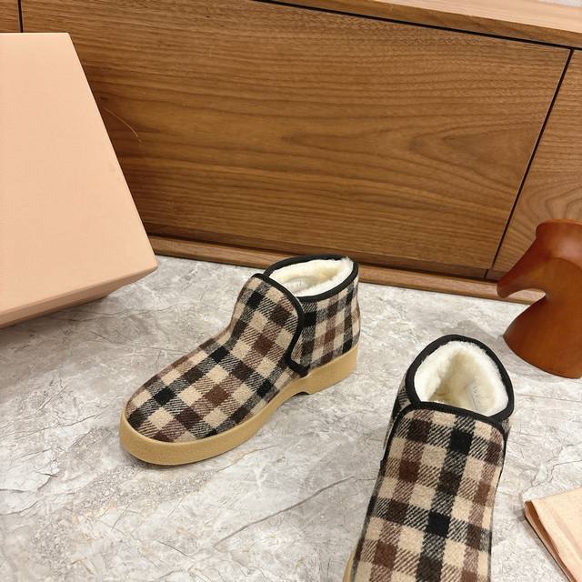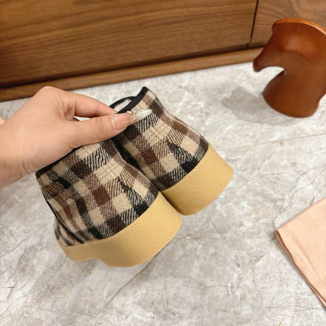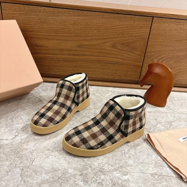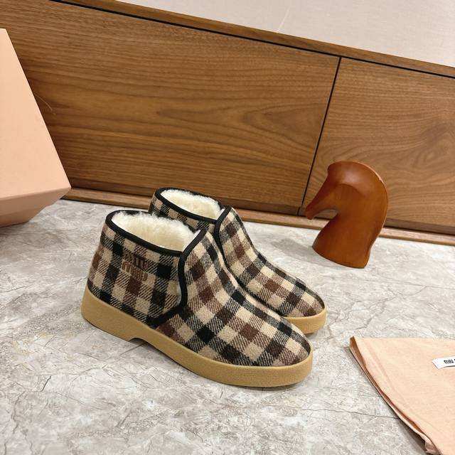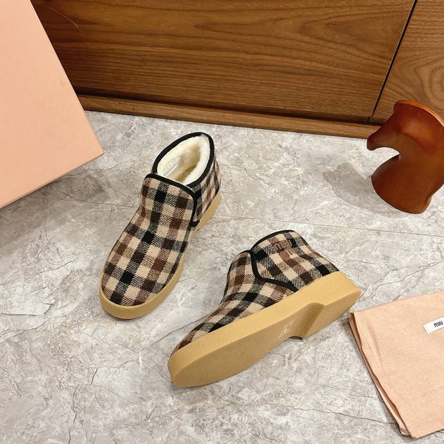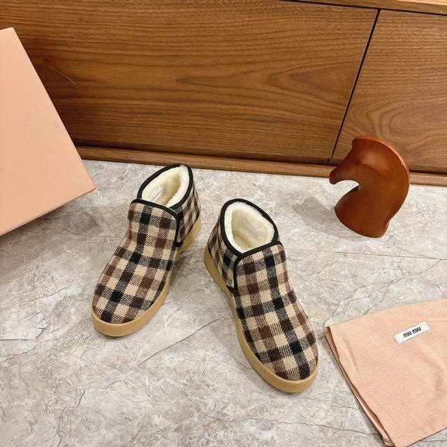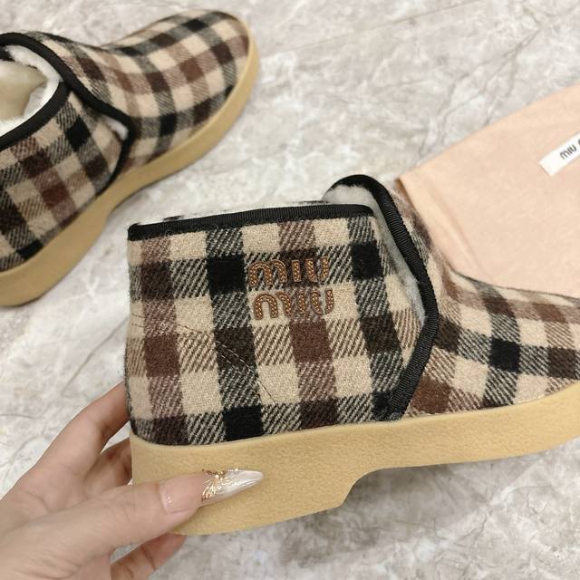 / 出厂 Miu格纹毛绒短靴Miumiu这款格纹毛绒短靴黑灰格纹+柔软毛绒内里保暖又舒适!鞋底橡胶材质防滑力满分秋冬穿超安心鑾靴筒高度刚好修饰腿型还方便穿脱日常通勤