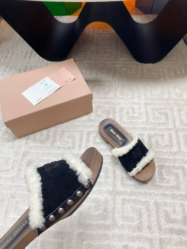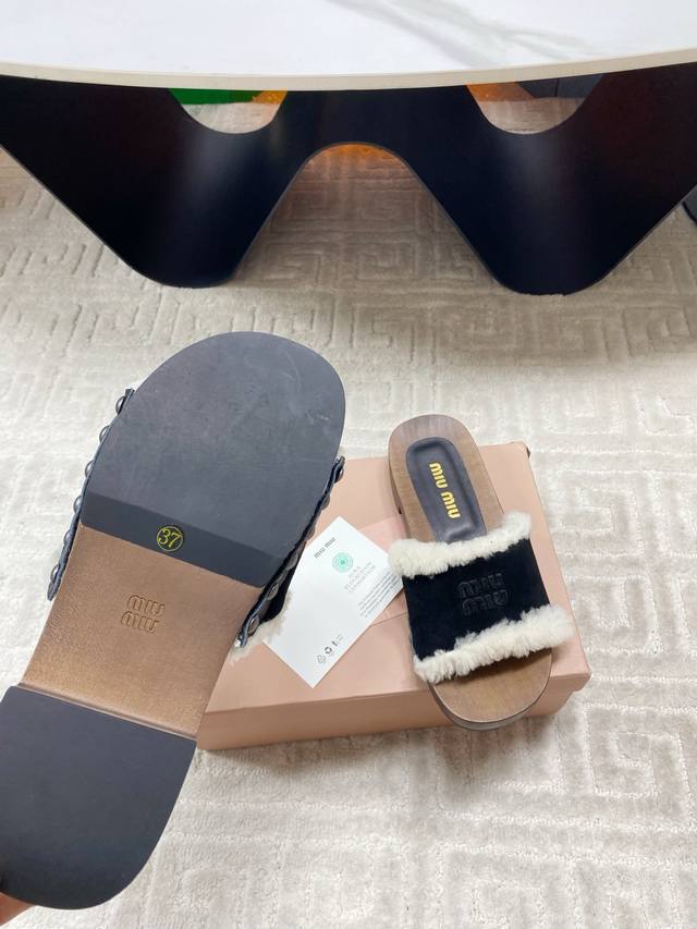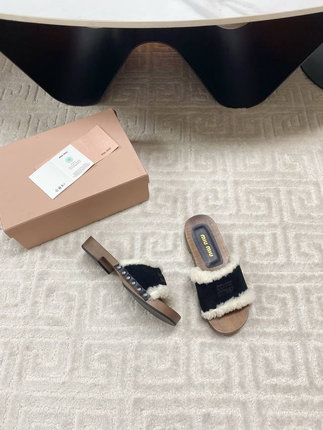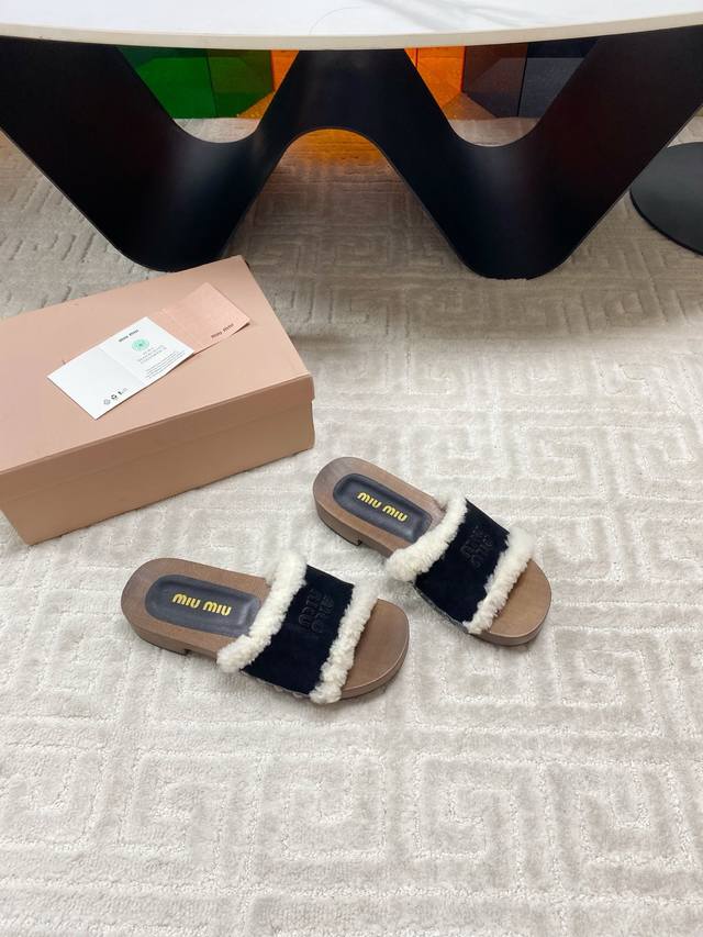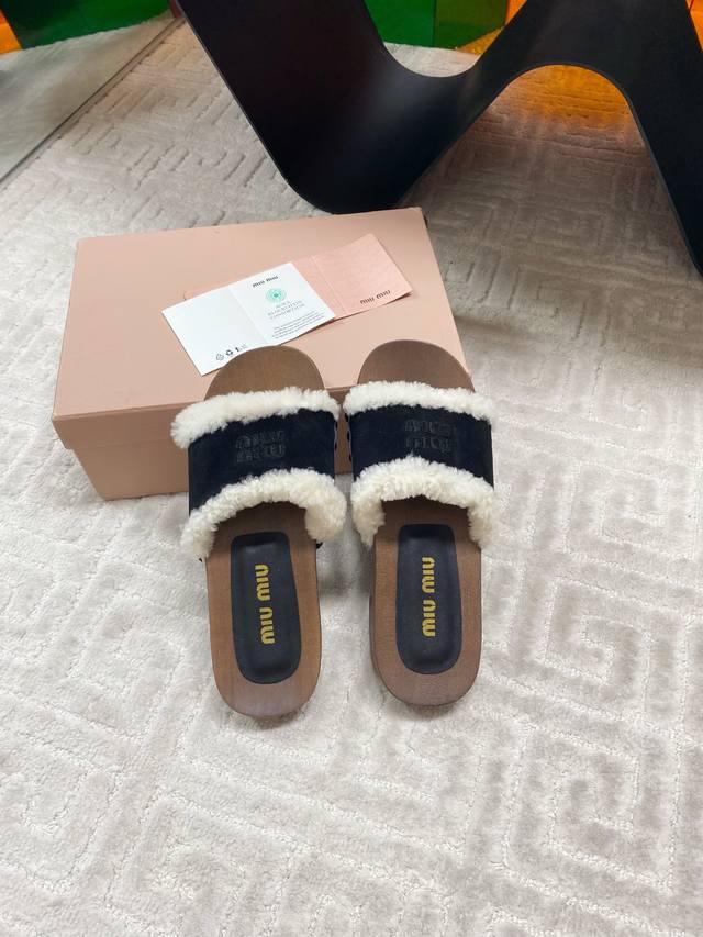 出厂 Miumiu 缪缪 2025Ss秋冬新款居家魔术贴毛毛拖鞋木底毛毛鞋