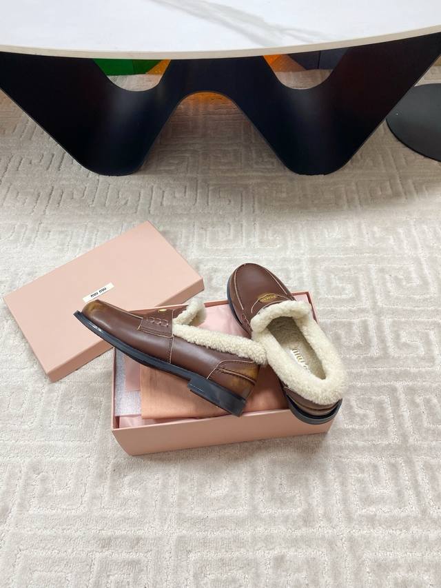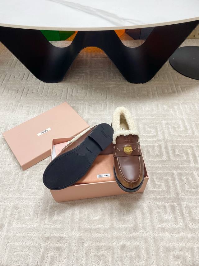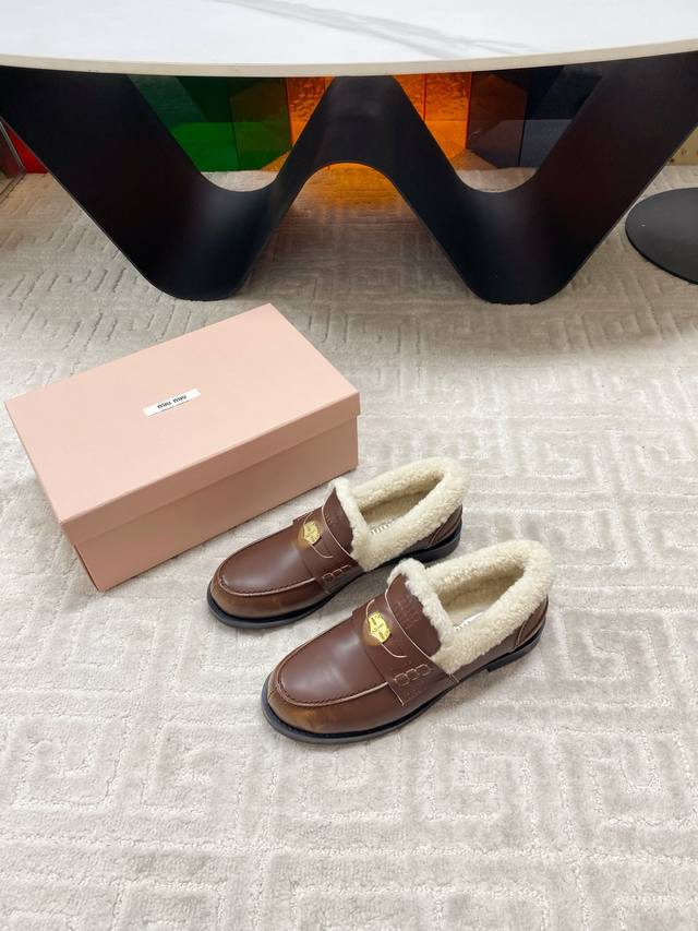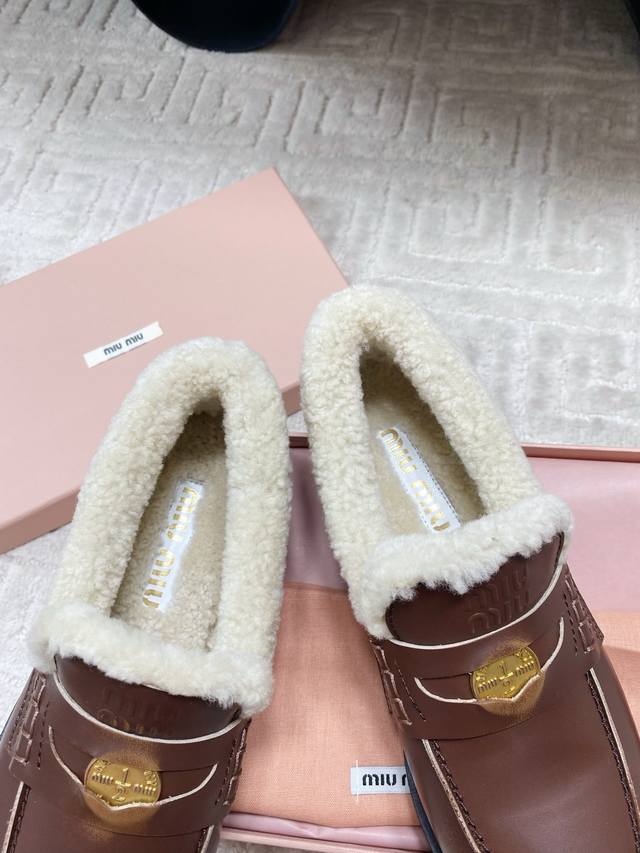 出厂 Miumiu 缪缪F049 2025Ss秋冬新款 幸运钱币系列驾车鞋加毛乐福鞋毛毛鞋 DDD 各路明星、小红书时尚博主都有种草。鞋面饰有硬币与压花Miu徽标,彰显别具一格的经典格调。上脚非常舒服超级保暖 搭配还是可咸可甜 DDD 鞋面:定制进口高丝光反绒牛皮 DDD 内里:进口羊卷毛 DDD 鞋底:原版开模橡胶大底 DDD 码数:35-39 40定制 DDD