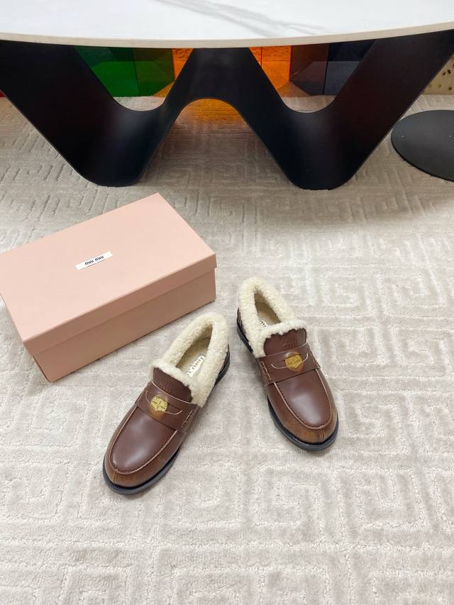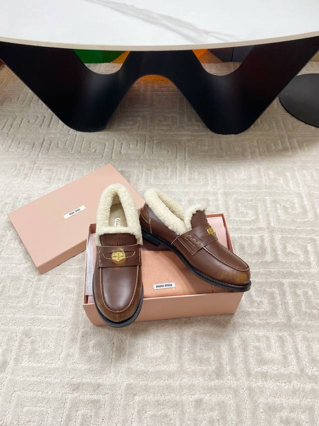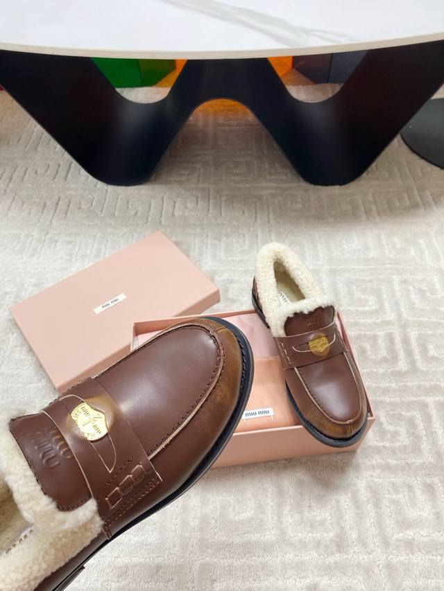 出厂 Miumiu 缪缪F049 2025Ss秋冬新款 幸运钱币系列驾车鞋加毛乐福鞋毛毛鞋 各路明星、小红书时尚博主都有种草。鞋面饰有硬币与压花Miu徽标,彰显