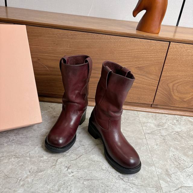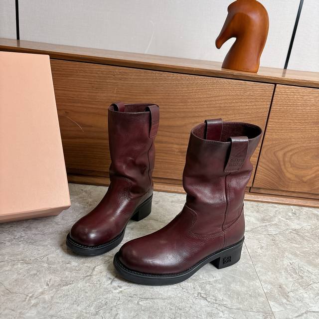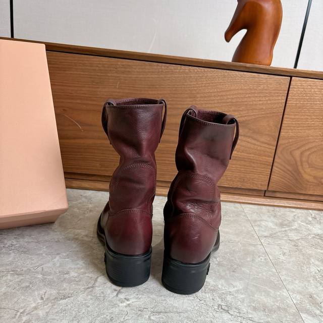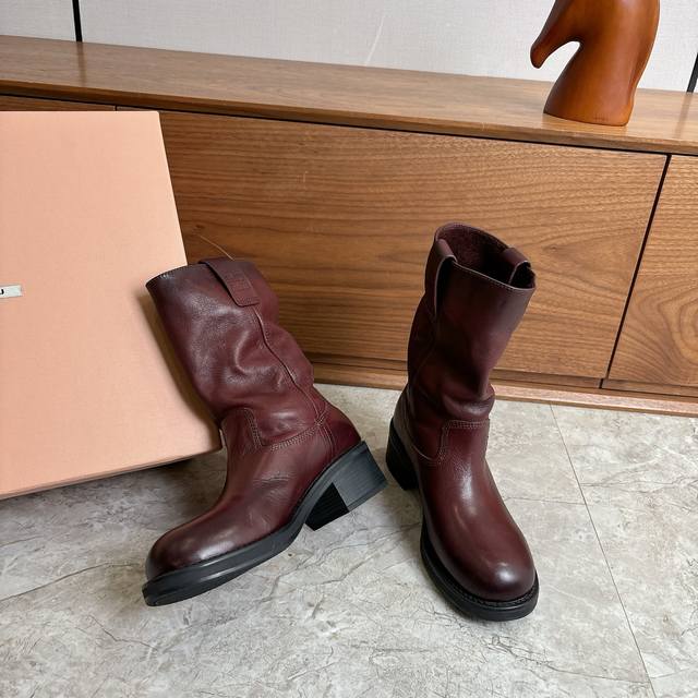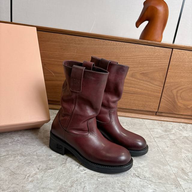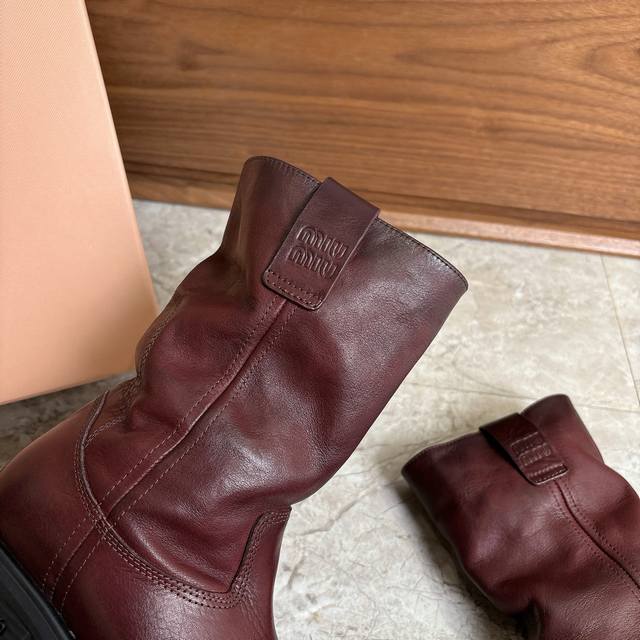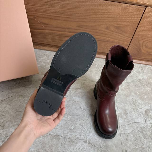 出厂 Miumiu 2026春夏走秀款堆堆靴 一脚蹬短靴 靴筒自然褶皱,慵懒随性,半内里设计轻薄不臃肿,秋冬穿搭氛围感满分。 鞋垫柔软,长时间穿也很舒适,Citywalk或日常出街都很合适。灵感融合职场与日常,刚柔并济,实用又时髦本季亮点单品之一! 面料采用水洗牛皮面料 原版开模橡胶鞋底防滑耐磨 码数35-39 40.41订做