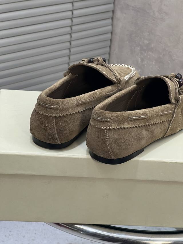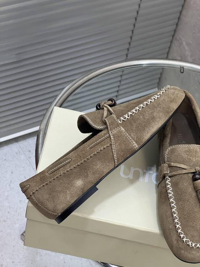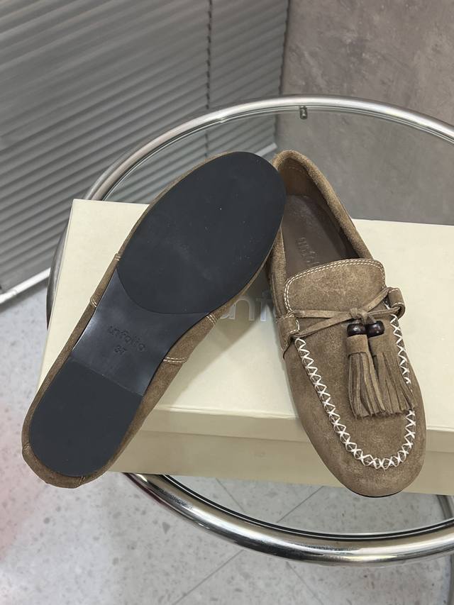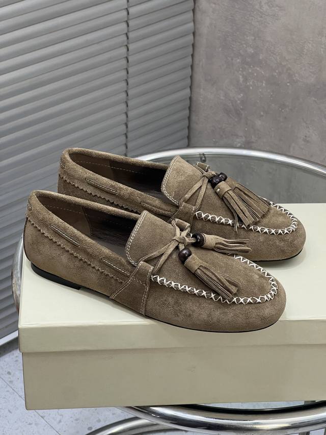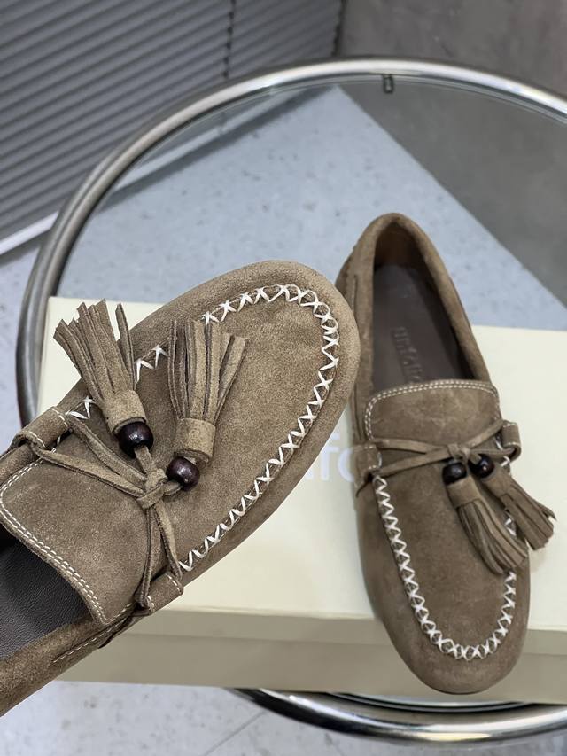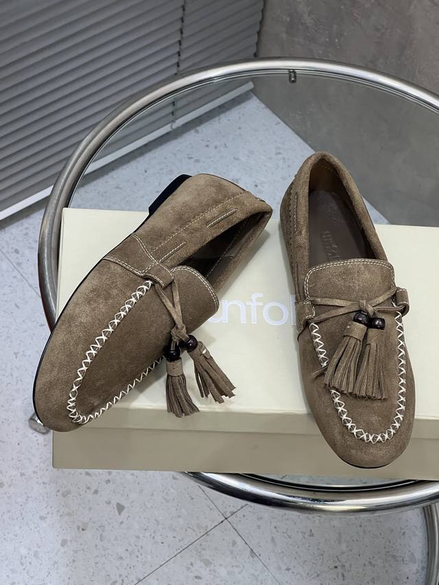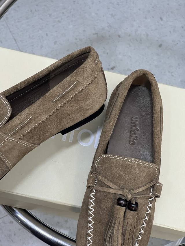 / 出厂 Unfolio 新款复古简约流苏平底乐福鞋 单鞋 麂皮材质,质感柔软且自带哑光高级感。设计有细节,鞋身带流苏、装饰珠和明线缝线,精致又有复古氛围。款式是套