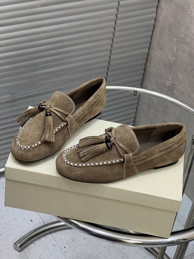 出厂 Unfolio 新款复古简约流苏平底乐福鞋 单鞋 麂皮材质,质感柔软且自带哑光高级感。设计有细节,鞋身带流苏、装饰珠和明线缝线,精致又有复古氛围。款式是套