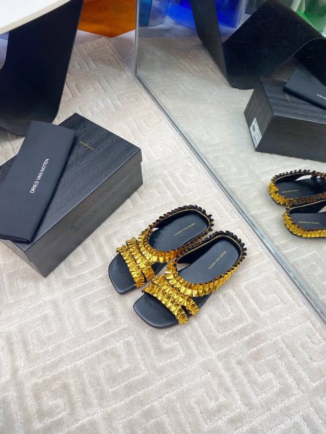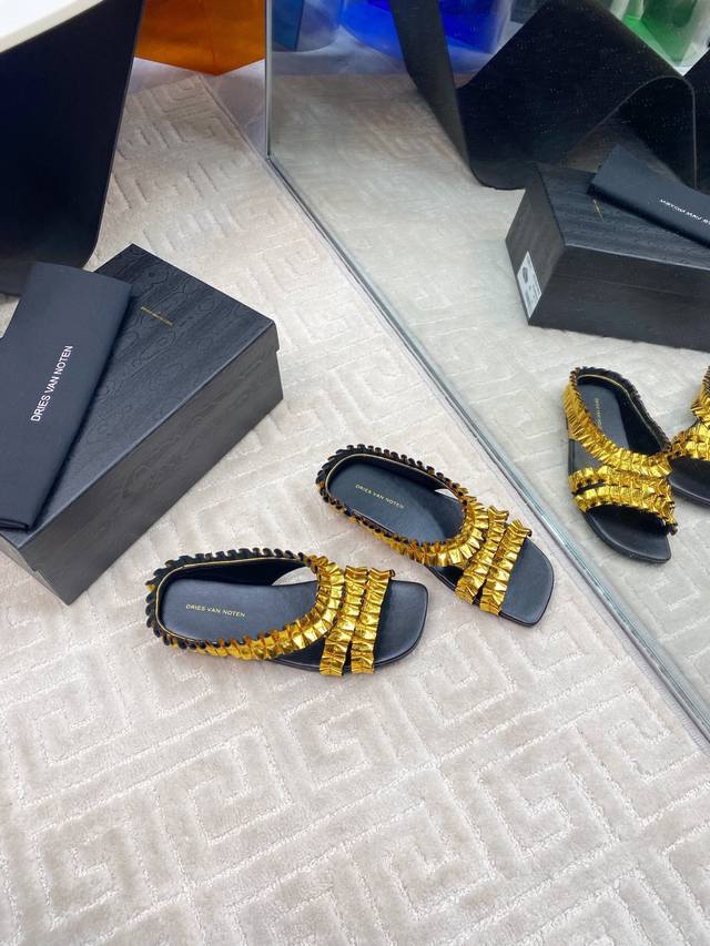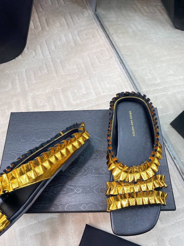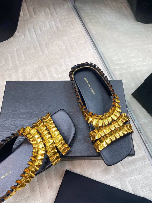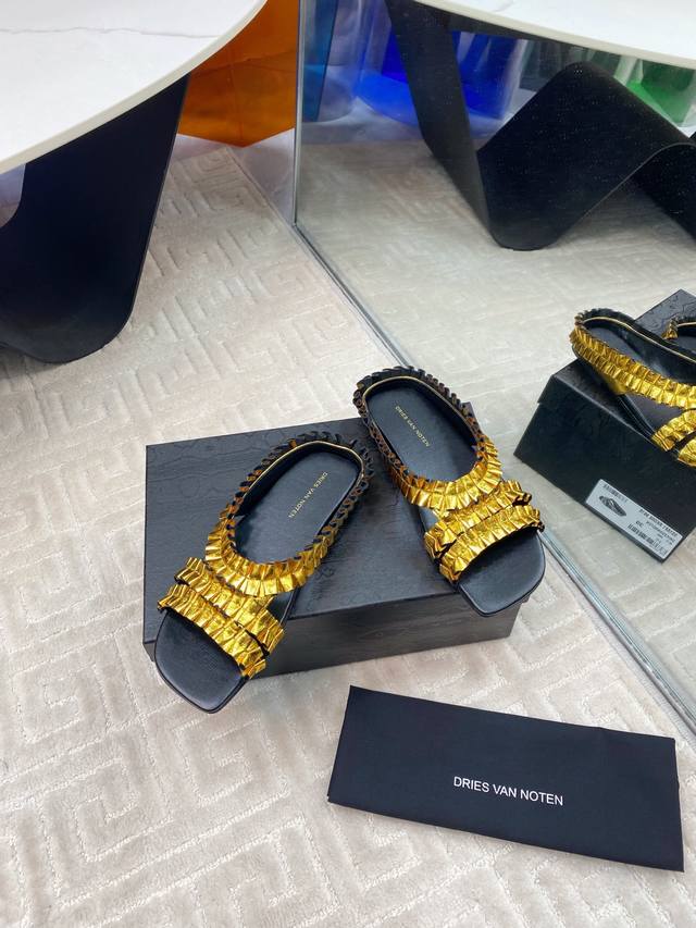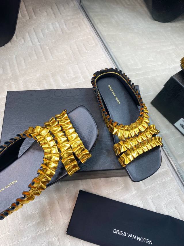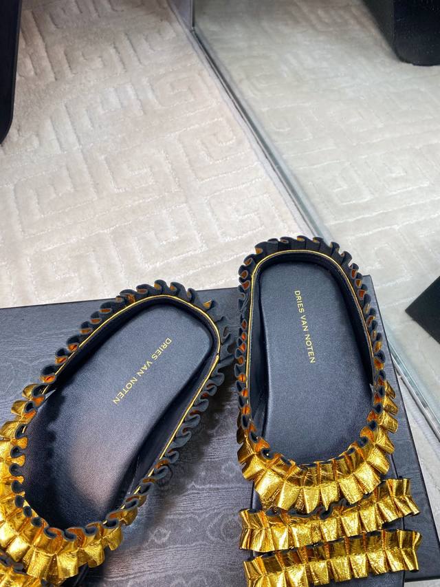 出厂400 Dries Van Noten金属感褶皱穆勒拖鞋,小众设计感拖鞋,上街穿搭老钱风,小金鞋在脚,步步生辉,金光闪闪个性十足