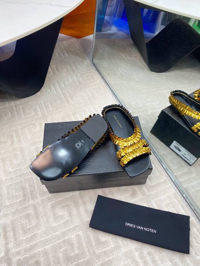 / 出厂400 Dries Van Noten金属感褶皱穆勒拖鞋,小众设计感拖鞋,上街穿搭老钱风,小金鞋在脚,步步生辉,金光闪闪个性十足 原版定制金属皮 真皮大底