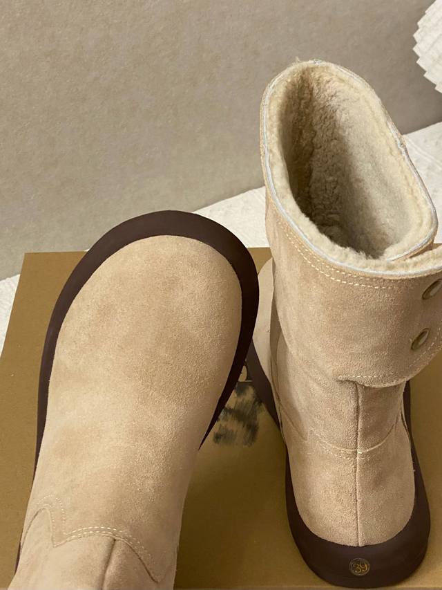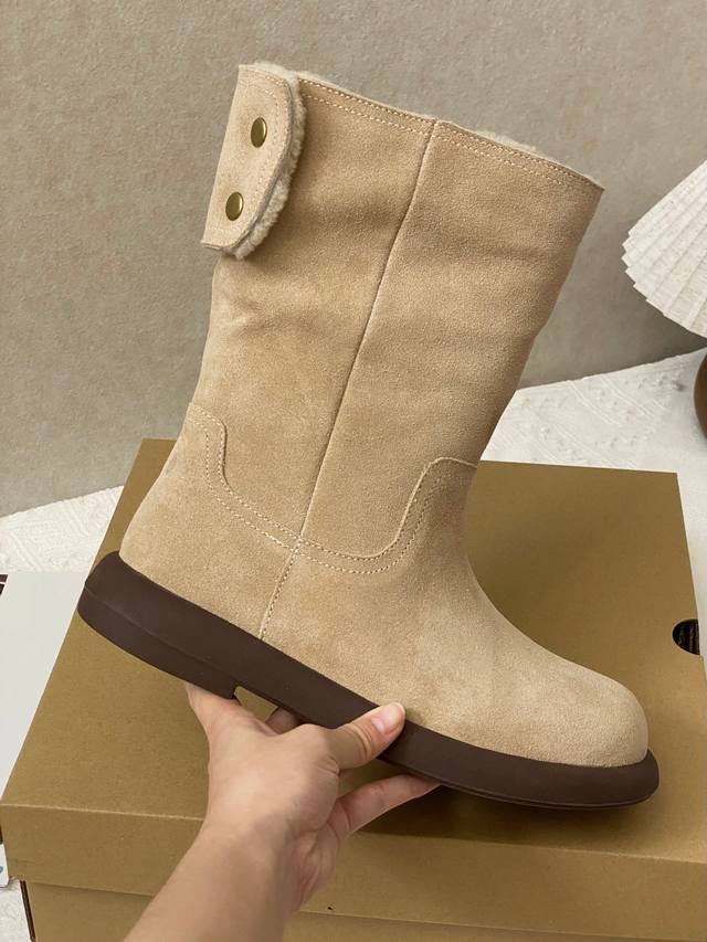 / 匠心细节: 高筒靴型搭配立体拼接鞋面 后跟精致金属扣点缀时尚基因 牛皮鞋面邂逅羊皮毛一体内里 1.5Cm黄金厚度羊毛锁温系统 轻量化防滑大底打造零负重体验 一鞋