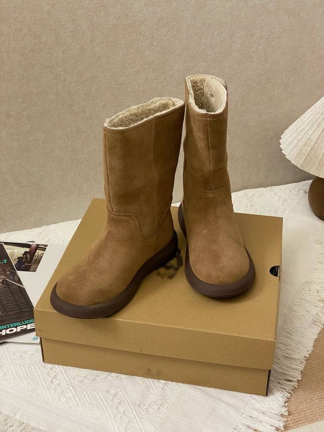 匠心细节: 高筒靴型搭配立体拼接鞋面 后跟精致金属扣点缀时尚基因 牛皮鞋面邂逅羊皮毛一体内里 1.5Cm黄金厚度羊毛锁温系统 轻量化防滑大底打造零负重体验 一鞋