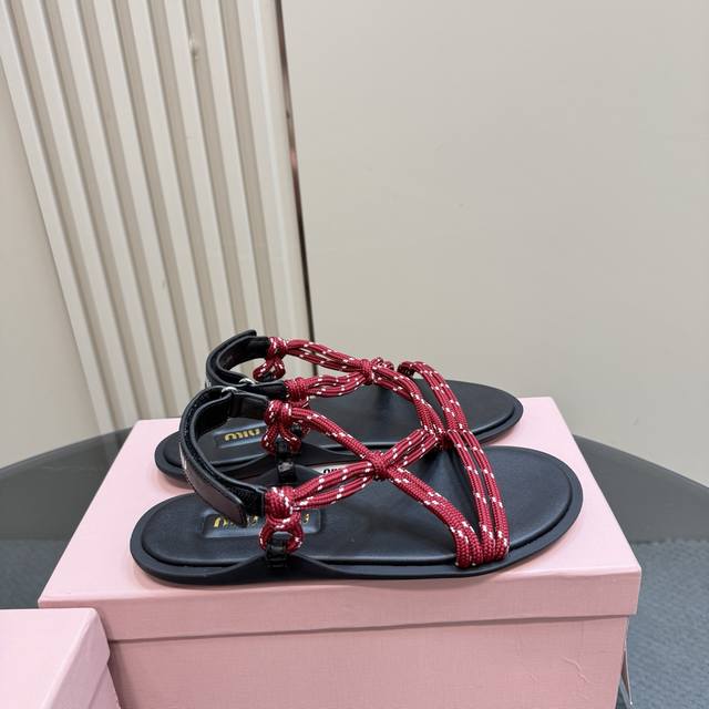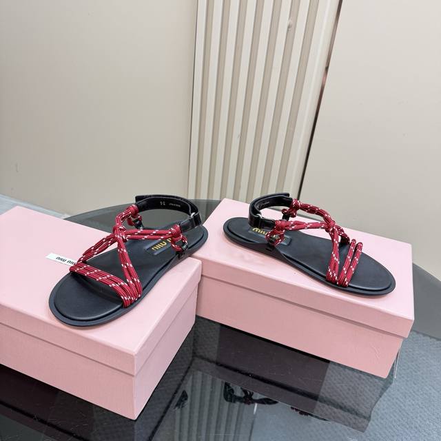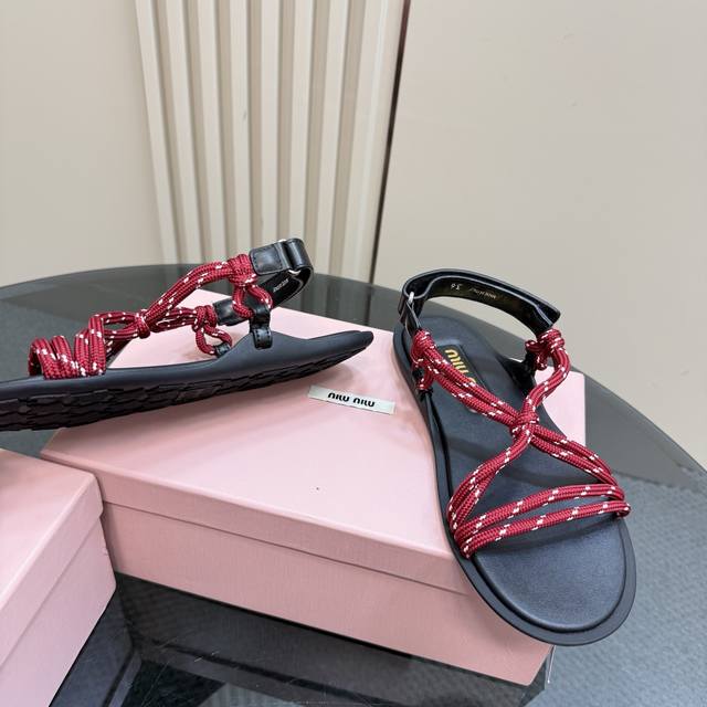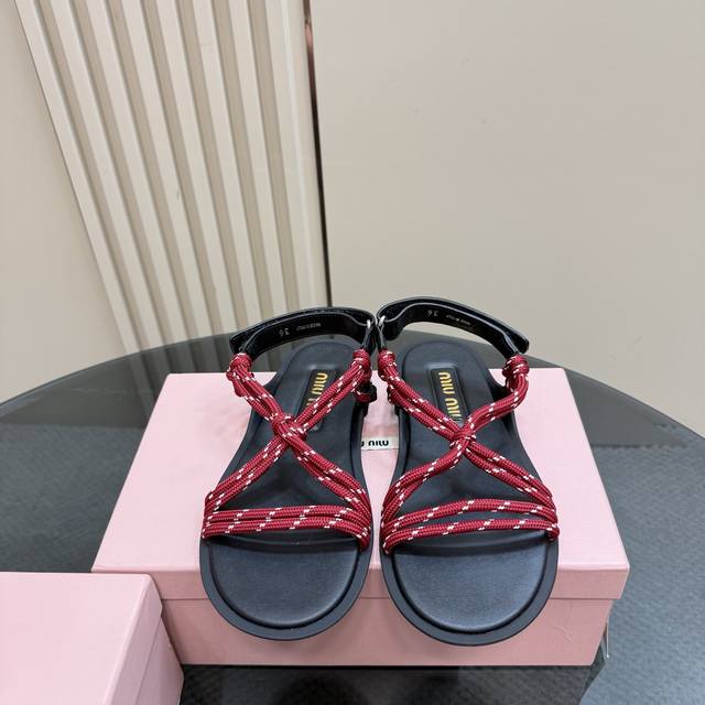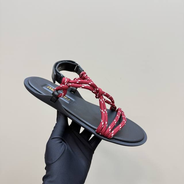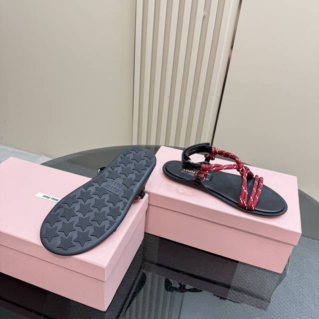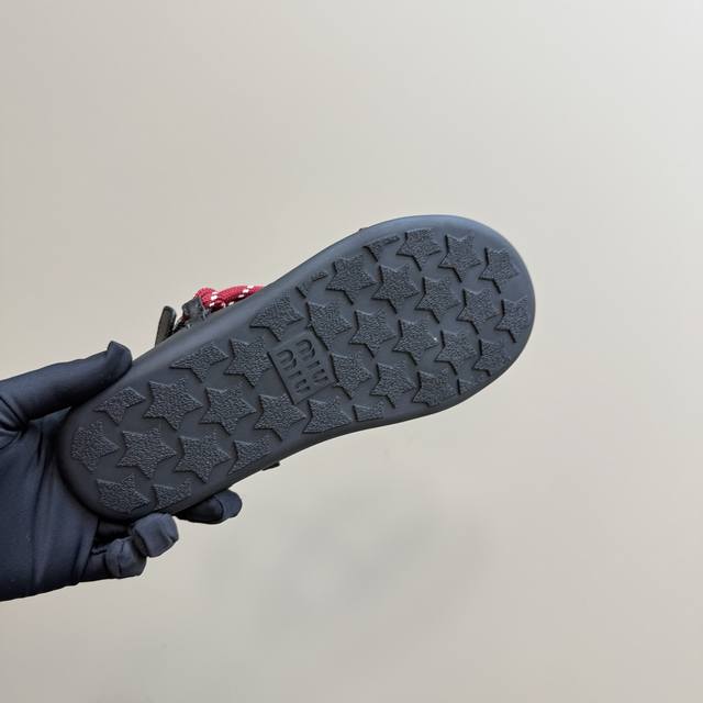 厂价p弹力绳 水钻300 Miu Miu 缪缪24S春夏新品 发布会巴黎时装周夹脚凉鞋 简直是夏天穿搭的时髦巅峰 鞋面采用进口牛皮 弹力绳 水钻 内里踮脚采用进
