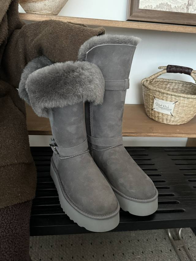 厚底骑士靴 秒变大长腿 两穿可翻毛 奶里奶气 毛茸茸慵懒风+皮带厚底设计 秋冬色系搭 栗色 巧克力色 灰色 配时尚元素爆棚 鞋面:羊皮毛一体 尺码:35-40