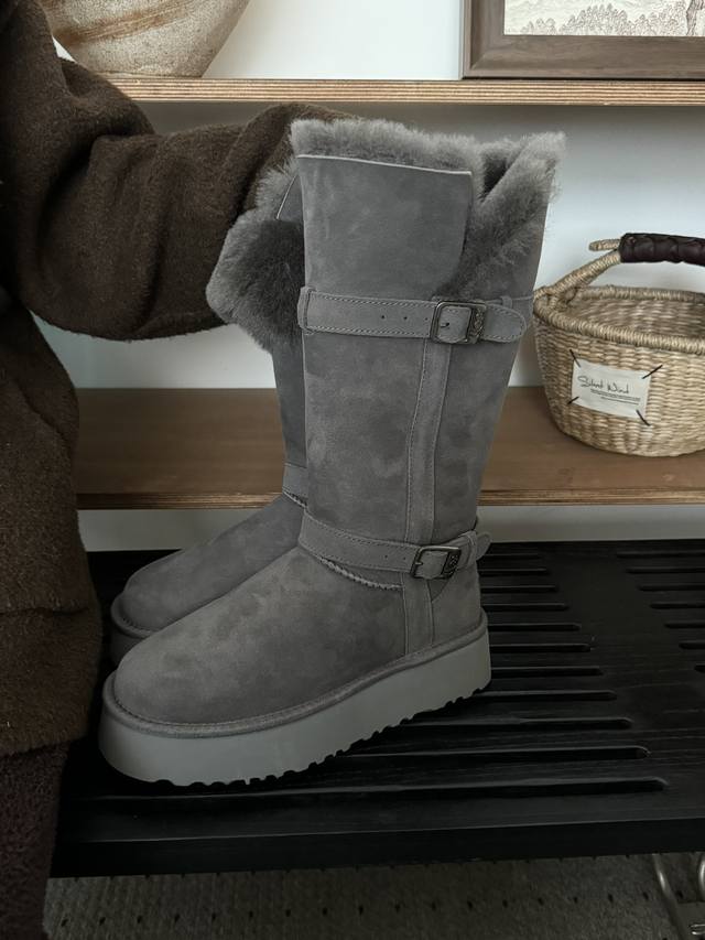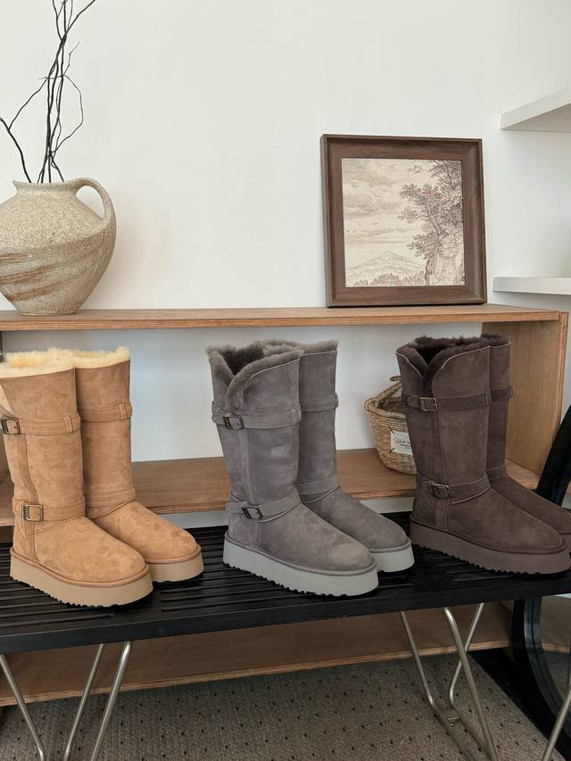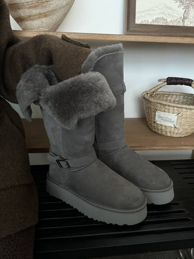 / 厚底骑士靴 秒变大长腿 两穿可翻毛 奶里奶气 毛茸茸慵懒风+皮带厚底设计 秋冬色系搭 栗色 巧克力色 灰色 配时尚元素爆棚 鞋面:羊皮毛一体 尺码:35-40