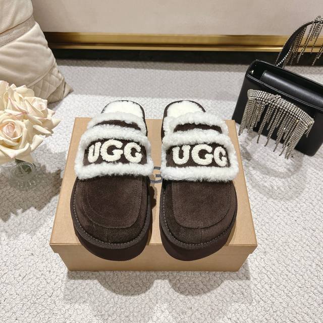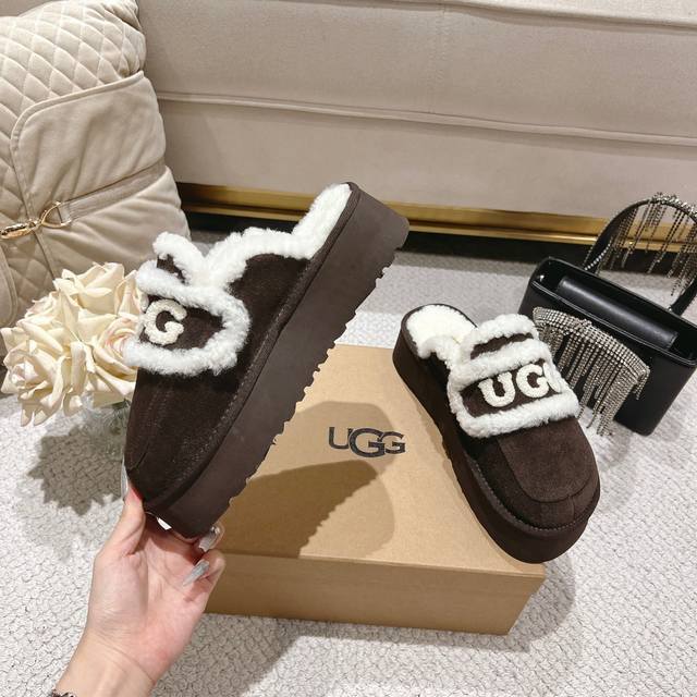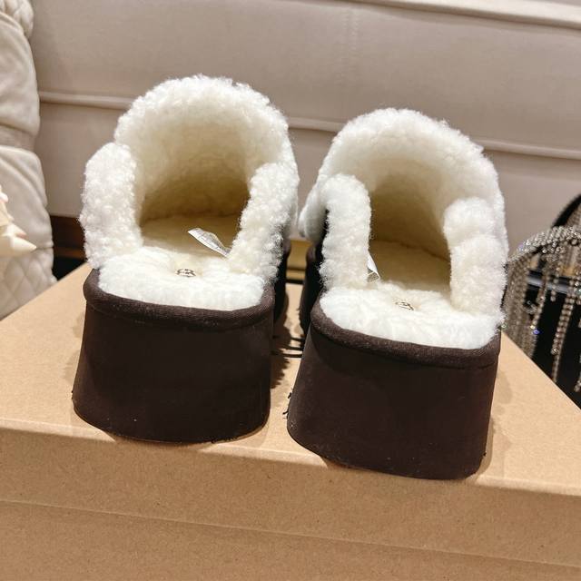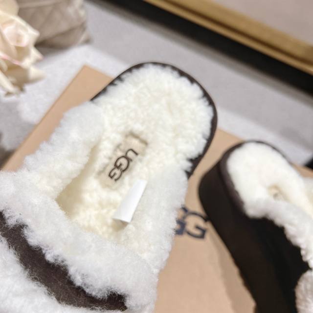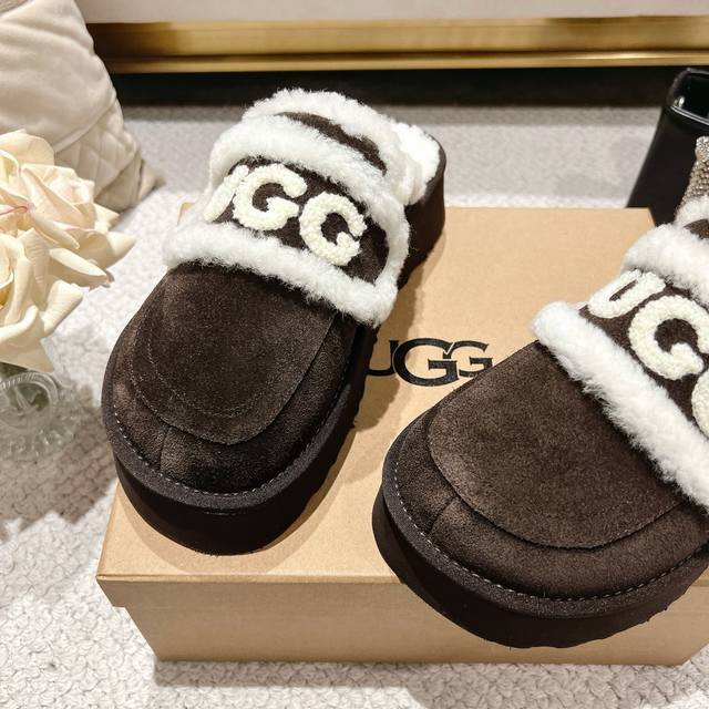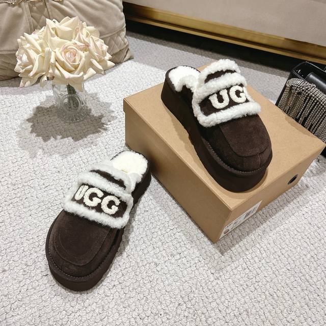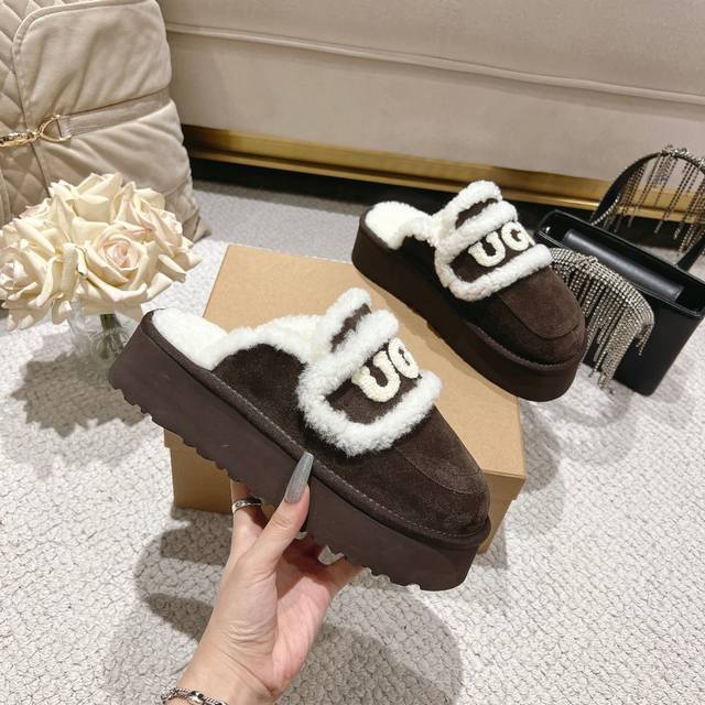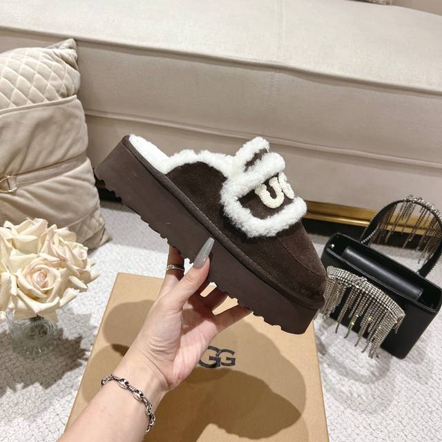 / 咖色 厚底 Ugg Logo拖鞋太火啦 一眼就上头的款式 胖胖的方圆头鞋 加上羊毛边边Logo 憨憨的可爱。鞋身很轻巧 走路简直可以跳起来! 四色:栗色 咖色