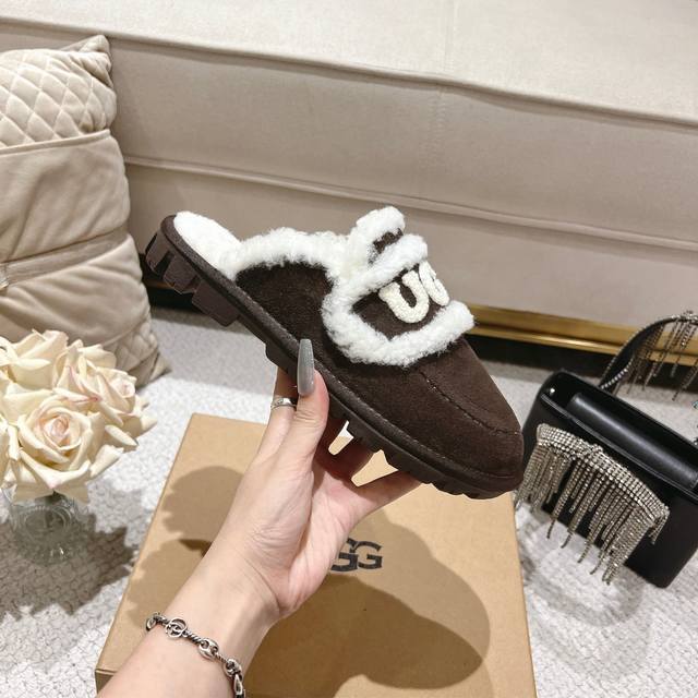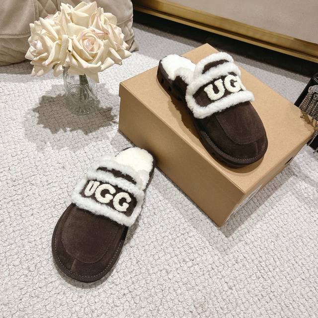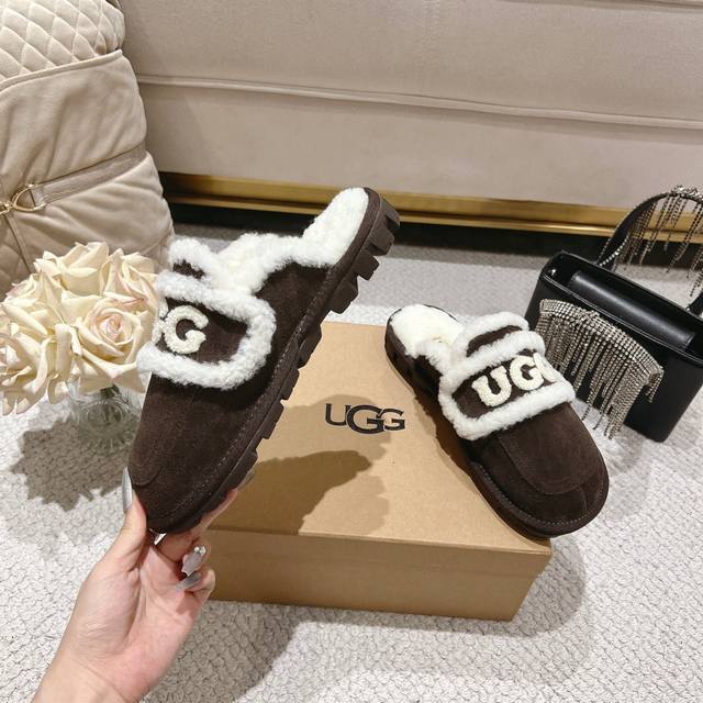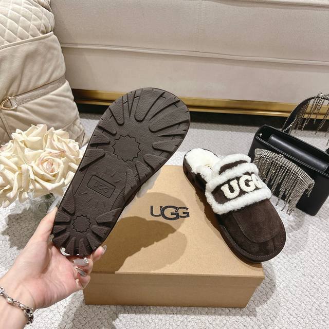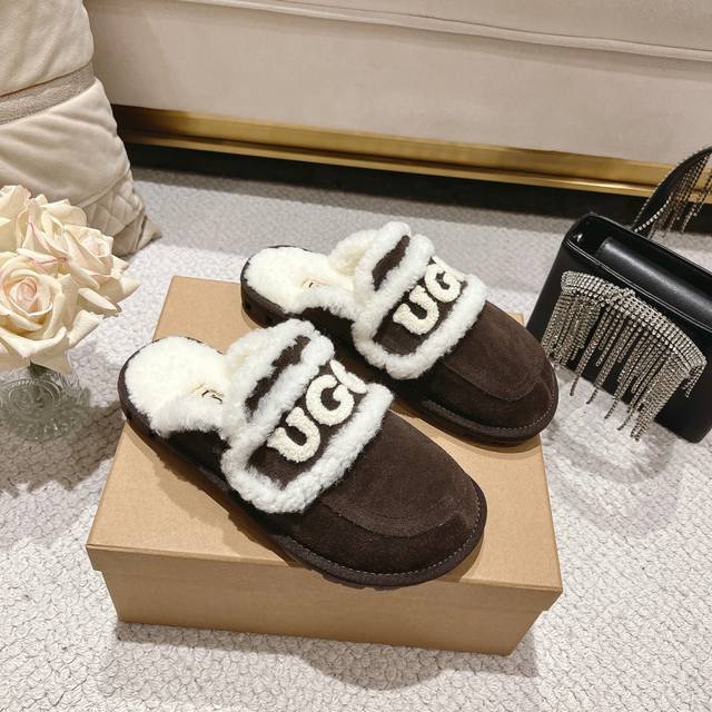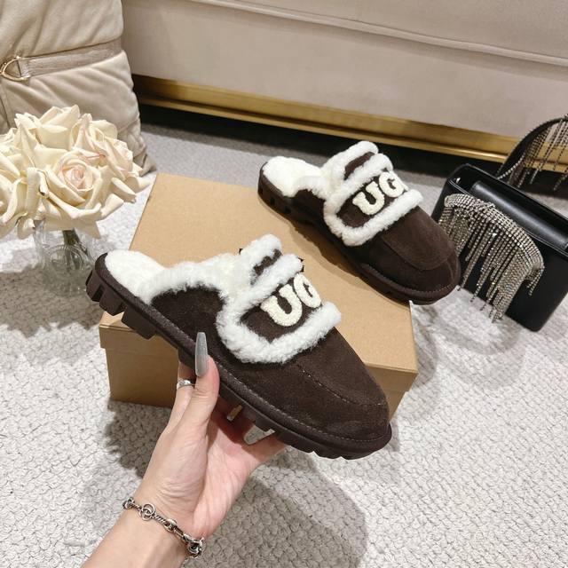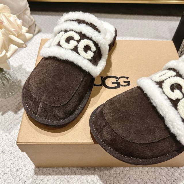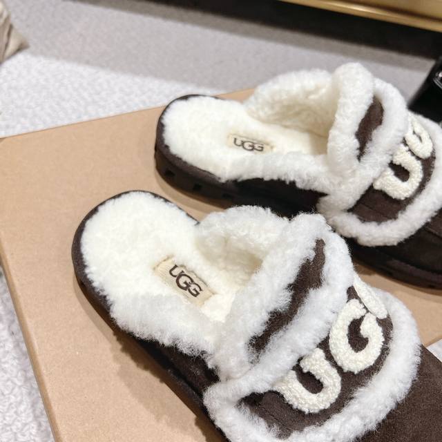 / 咖色 Ugg Logo拖鞋太火啦 一眼就上头的款式 胖胖的方圆头鞋 加上羊毛边边Logo 憨憨的可爱。鞋身很轻巧 走路简直可以跳起来! 四色:栗色 咖色 沙色
