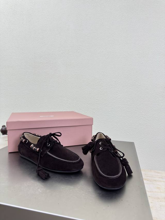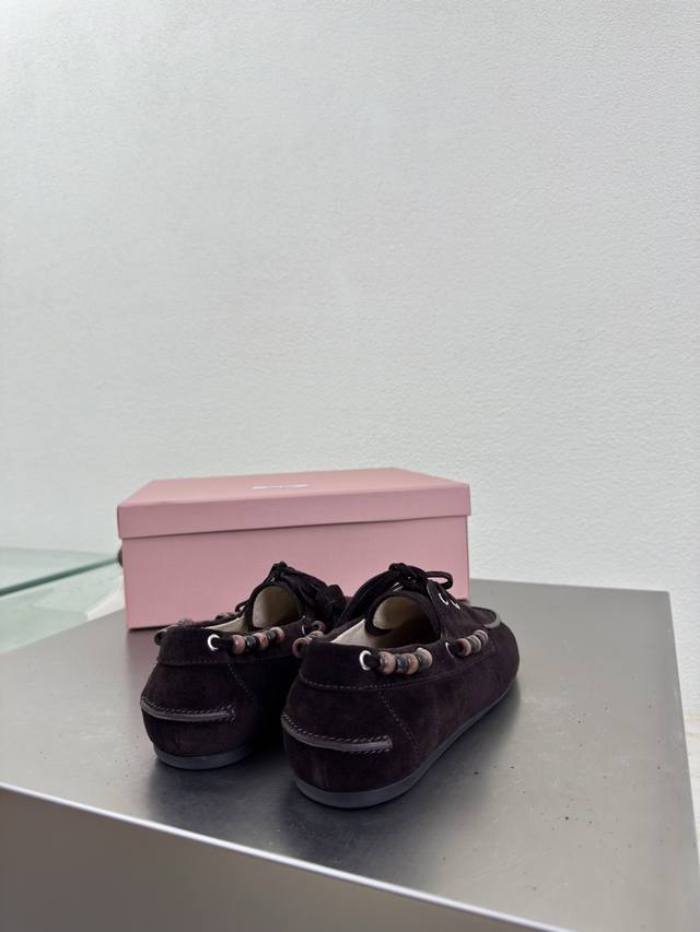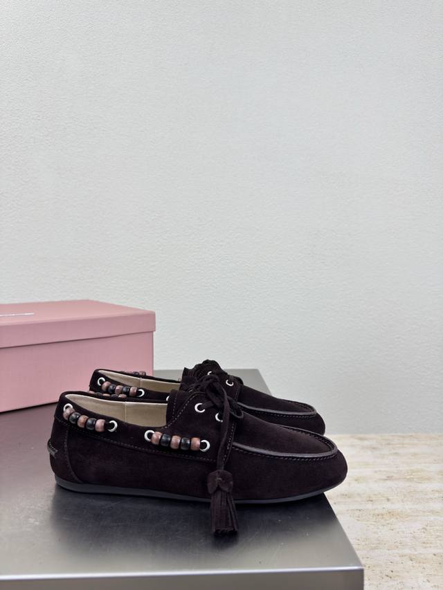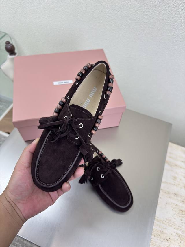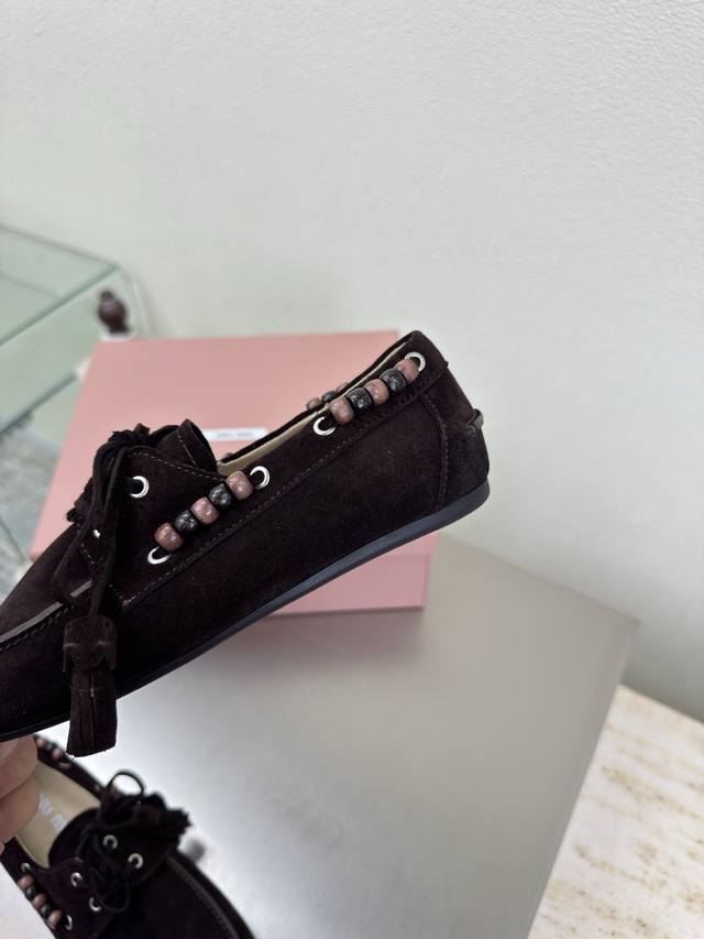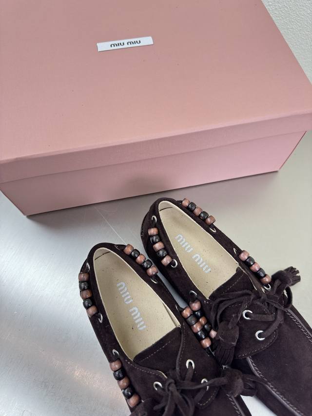复古木珠装饰 Miu'miu 乐福鞋 DDD 深咖啡色 高丝光牛反绒皮 DDD 平底设计 DDD 系列 Miu'miu 经典舒适 制作 DDD 原版一致 成型大底 高版本 DDD 面料 高丝光牛反绒皮 DDD 立体针车工艺 DDD 原版一致 对版 DDD 设计 少女感 舒适 DDD 对标对版 DDD 35 36 37 38 39 40 41 40 41 码定制 DDD 配置原版包装 DDD