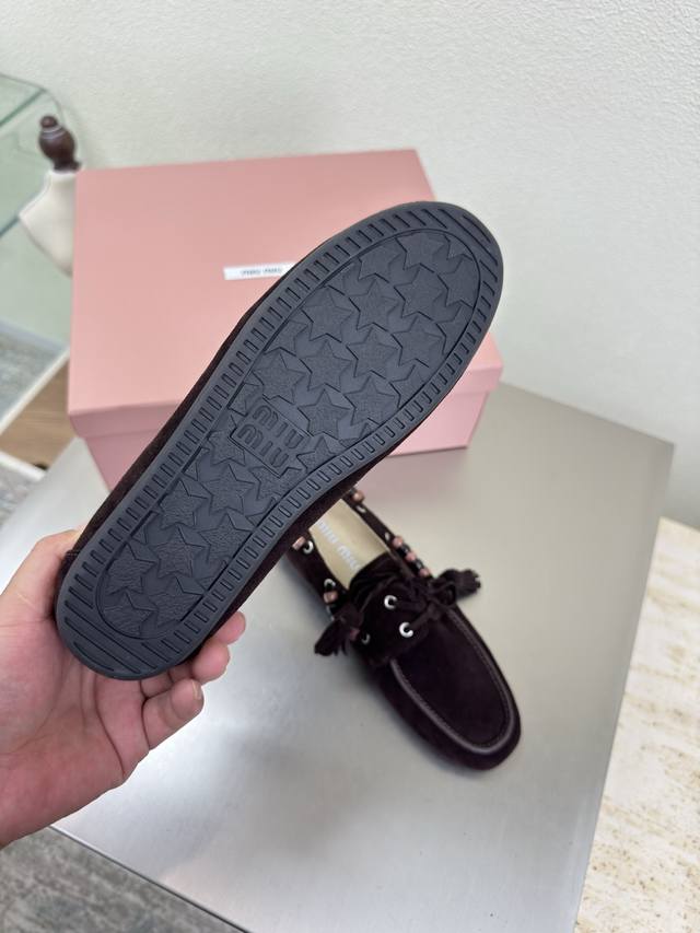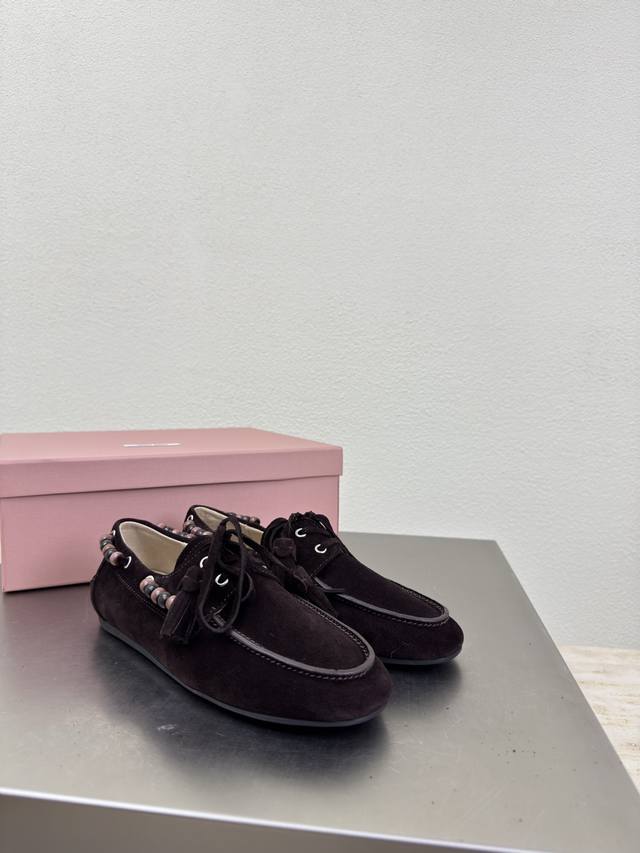 复古木珠装饰 Miu'miu 乐福鞋 深咖啡色 高丝光牛反绒皮 平底设计 系列 Miu'miu 经典舒适 制作 原版一致 成型大底 高版本 面料 高丝光牛反绒皮