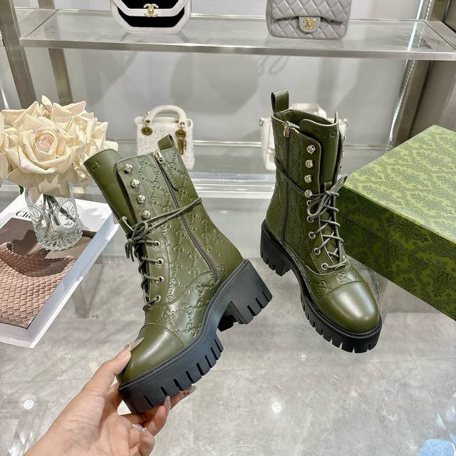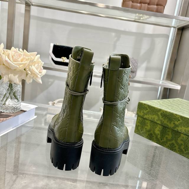女士Gg系带牛皮面踝靴 这款系带踝靴采用标志性Gg牛皮革精心制作,彰显品牌隽永优雅的美学风格。这款踝靴采用大胆的廓形设计,搭配橡胶沟纹鞋底,提供稳固支撑的同时,