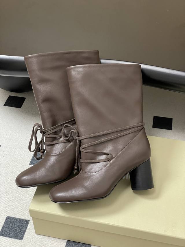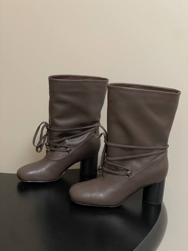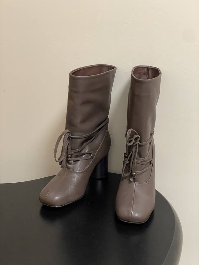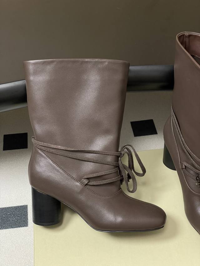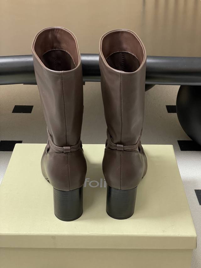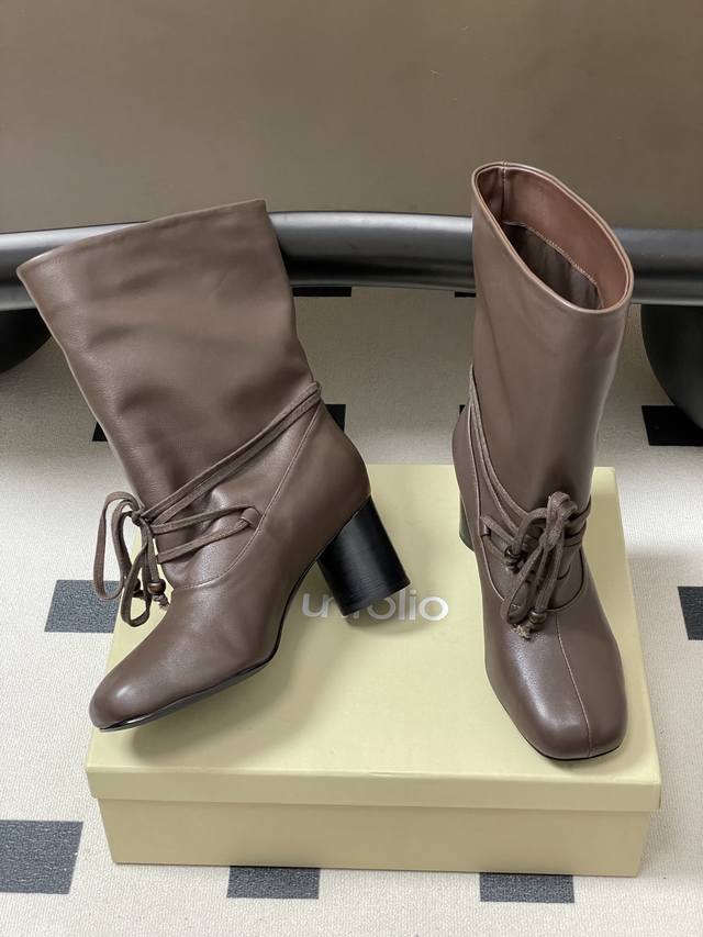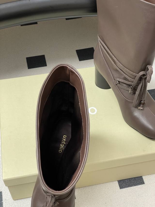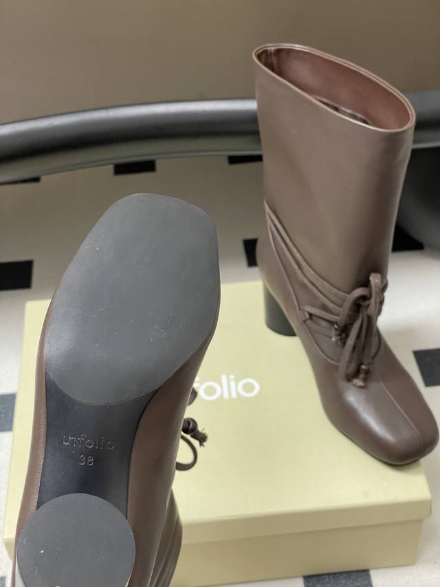 小众品牌 Unfolio 25Aw秋冬新款束带粗跟短靴宽筒一脚蹬直筒靴短筒堆堆靴 DDD Elliot 束带粗跟短靴鞋面均采用超柔软牛皮,质地细腻且延展性优异,能随足部活动自然贴合。内里均采用弹力莱卡植物纤维材质,具备出色的弹性,贴合足部曲线且亲肤不刺激,确保长时间穿着的舒适感。鞋垫为羊皮材质,提供柔软支撑,减轻行走压力;7Cm黄金跟高保证了美观和舒适度的平衡。鞋底采用橡胶材质,纹理设计增强抓地力,适应日常地面环境,提升行走稳定性。 DDD 方圆鞋头勾勒利落线条,自带沉静高智感氛围。宽幅鞋楦提升脚型包容度