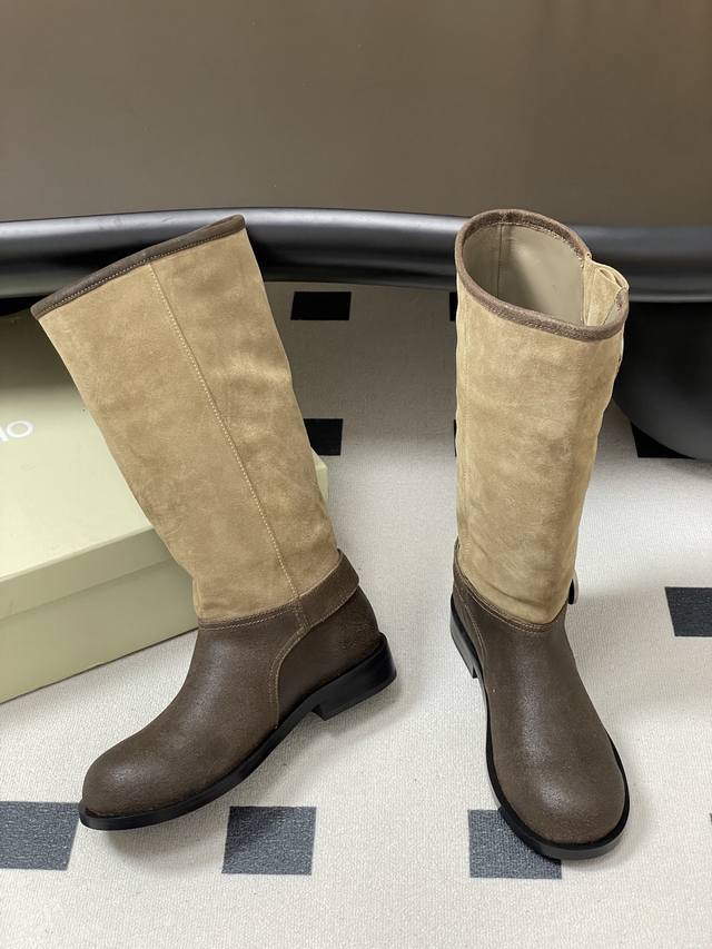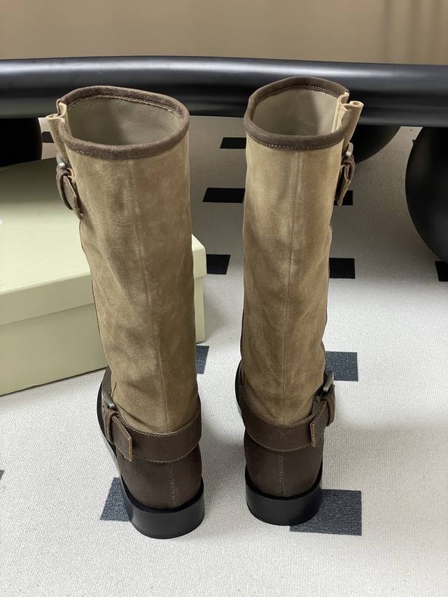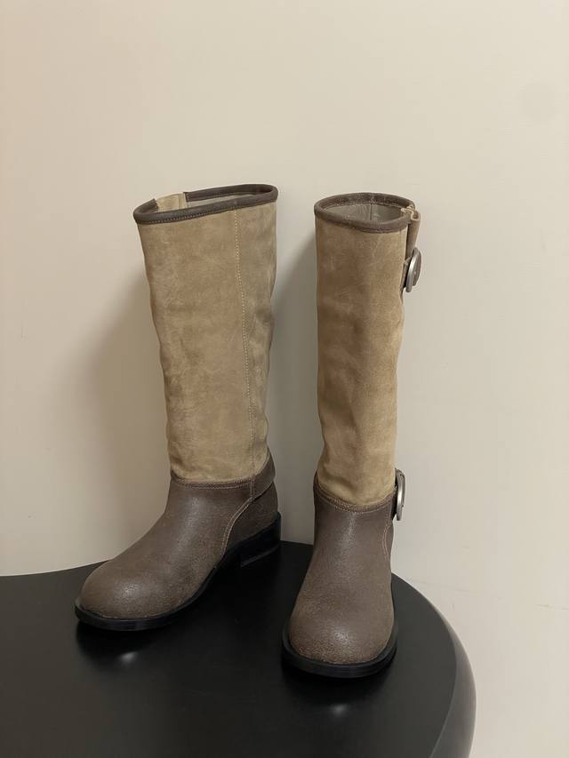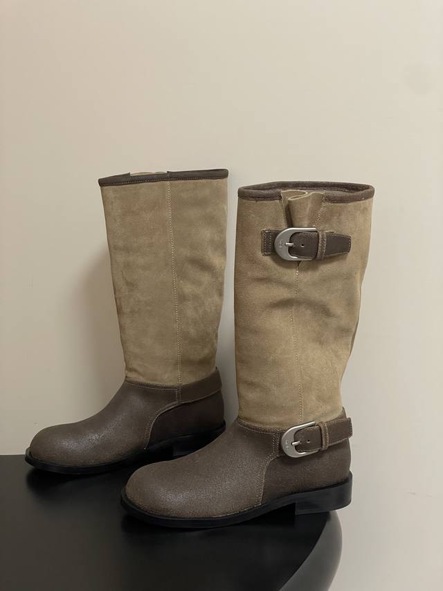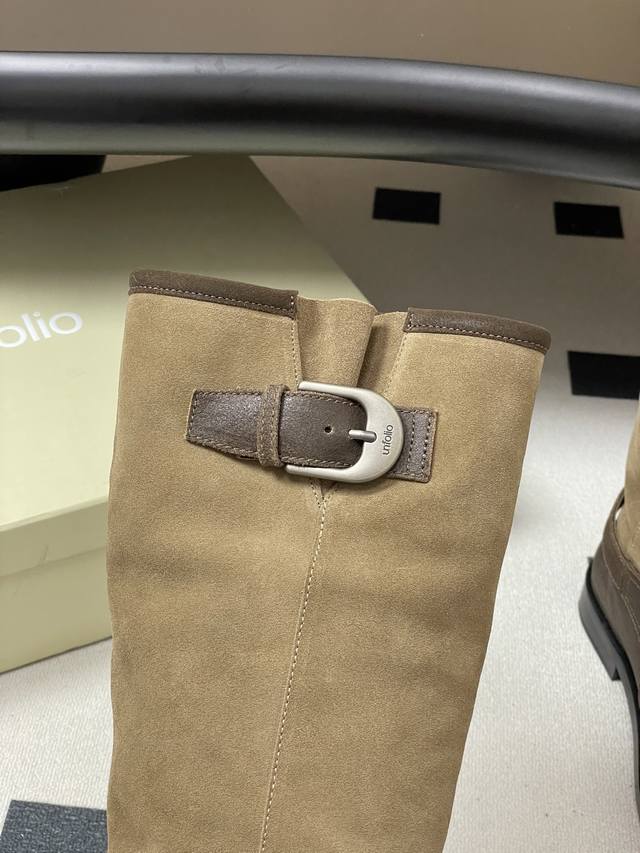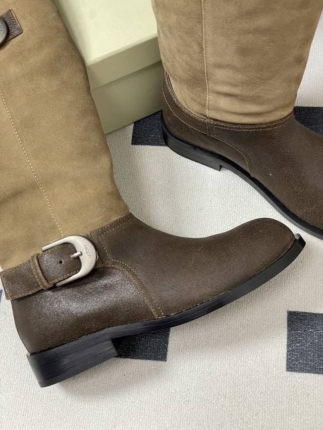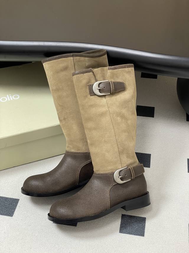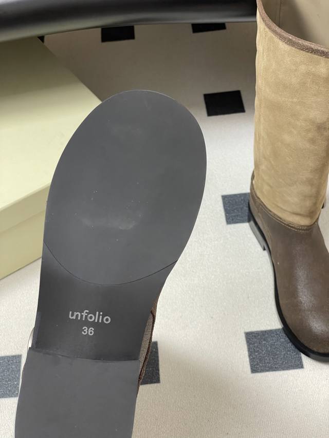 小众品牌 Unfolio 25Aw秋冬新款皱面宽筒一脚蹬直筒靴搭扣长筒堆堆靴 这双靴简直是秋冬时髦王炸 卡其与深棕撞色 自带复古腔调 褶皱设计+金属扣 细节感拉满 上脚随性又有范儿 不管配大衣还是卫衣 都能轻松穿出高级感~ 不同配色的鞋面分别采用光面质感的小牛皮、做旧表面质感的牛皮与翻毛皮拼接以及全翻毛皮作为鞋面,靴筒内里则选择细腻的弹力莱卡织物,材质顺滑流畅,入脚的一瞬,便能即刻感受到靴子特有的舒适感。特别定制的加厚橡胶鞋底,方便打理,更适合日常高频率穿着。 鞋面:小牛皮 牛反绒 内里垫脚:羊皮 鞋底: