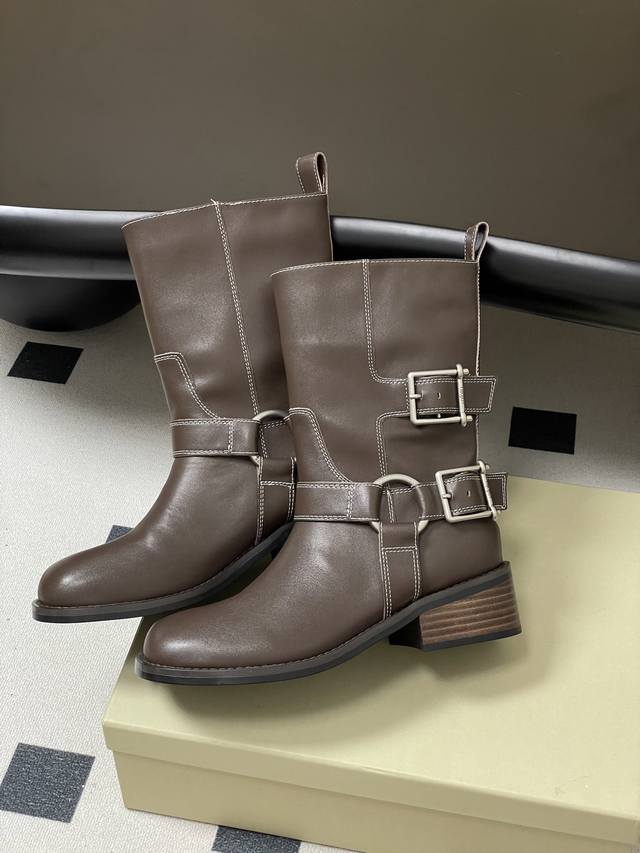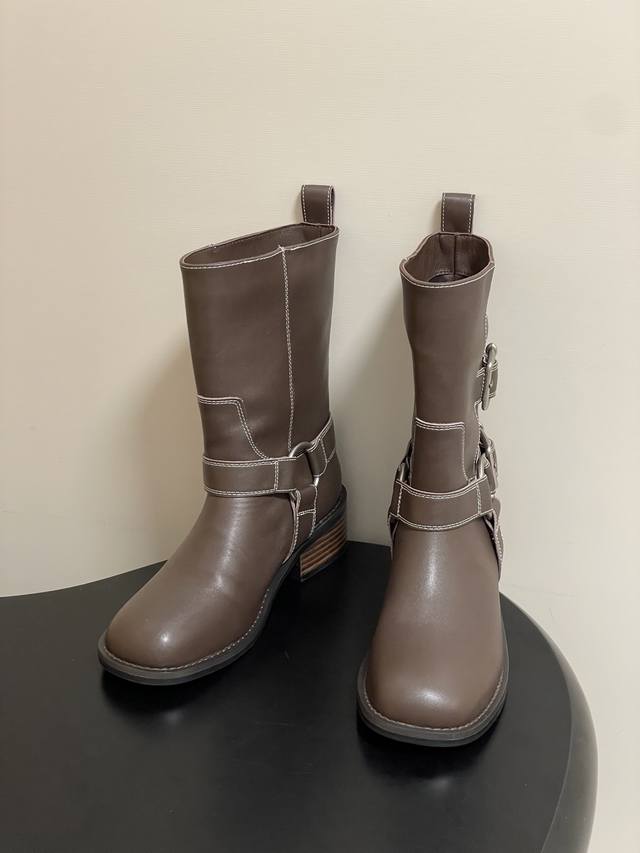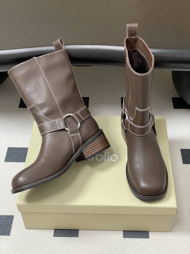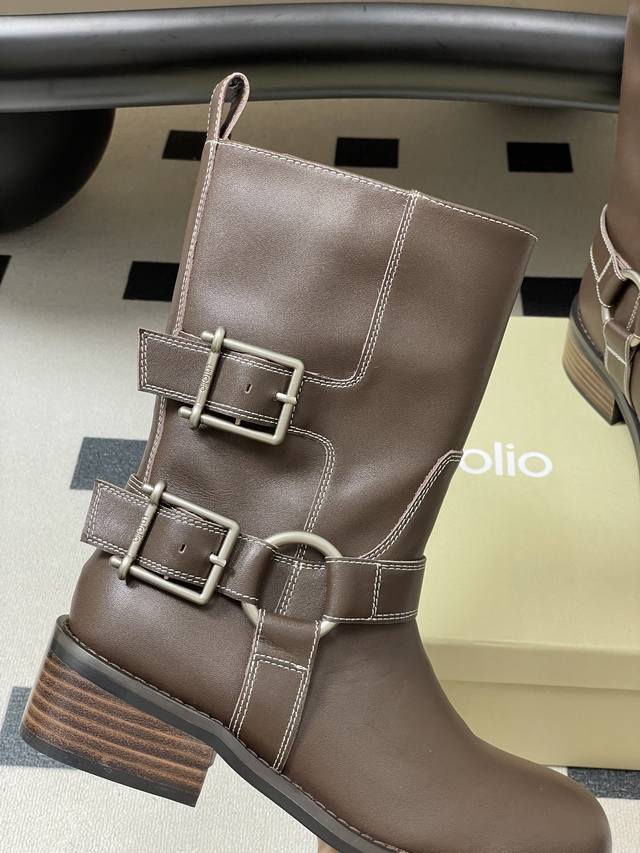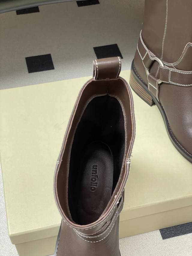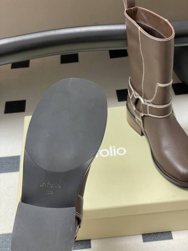 小众品牌 Unfolio 25Aw秋冬新款Harper 搭扣踝靴直筒中靴西部机车复古风一脚蹬粗跟短靴 DDD Harper 搭扣踝靴以材质巧思演绎机车踝靴格调。黑色与栗棕色款选用树膏牛皮,自带细腻肌理与温润光泽,随穿着渐显特有质感;做旧卡其款则采用翻毛牛皮,经手工做旧处理,每一处纹理都透着松弛随性。内里依配色差异化设计,分别搭载牛皮、柔滑羊皮与亲肤织物,适配不同穿着需求。金属搭扣特别采用做旧质感表面工艺,色泽温润不张扬。5厘米方跟兼顾增高与行走稳度,鞋底抗滑设计,轻松适配多元穿搭场景。 DDD 鞋头采用经