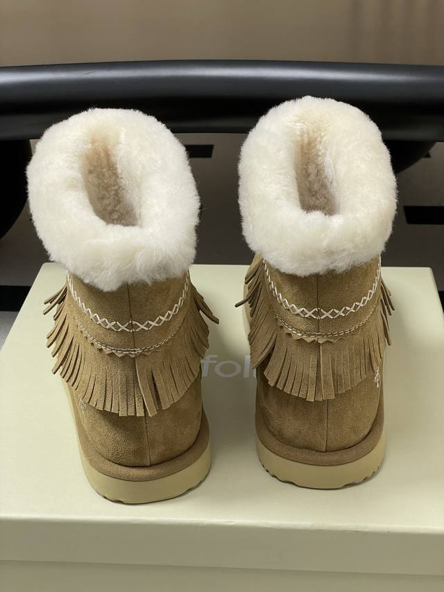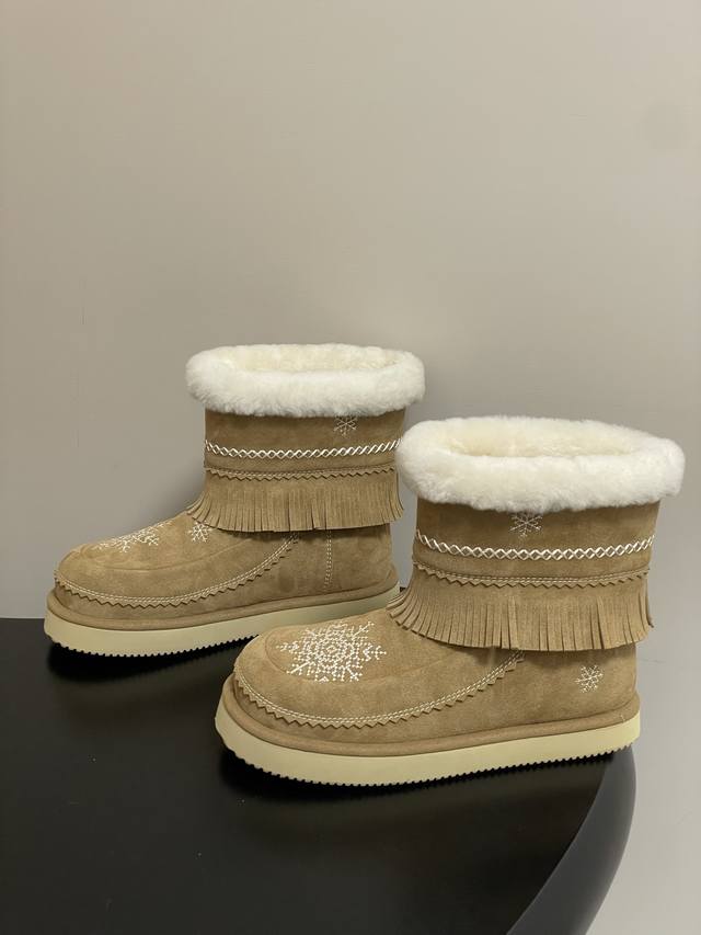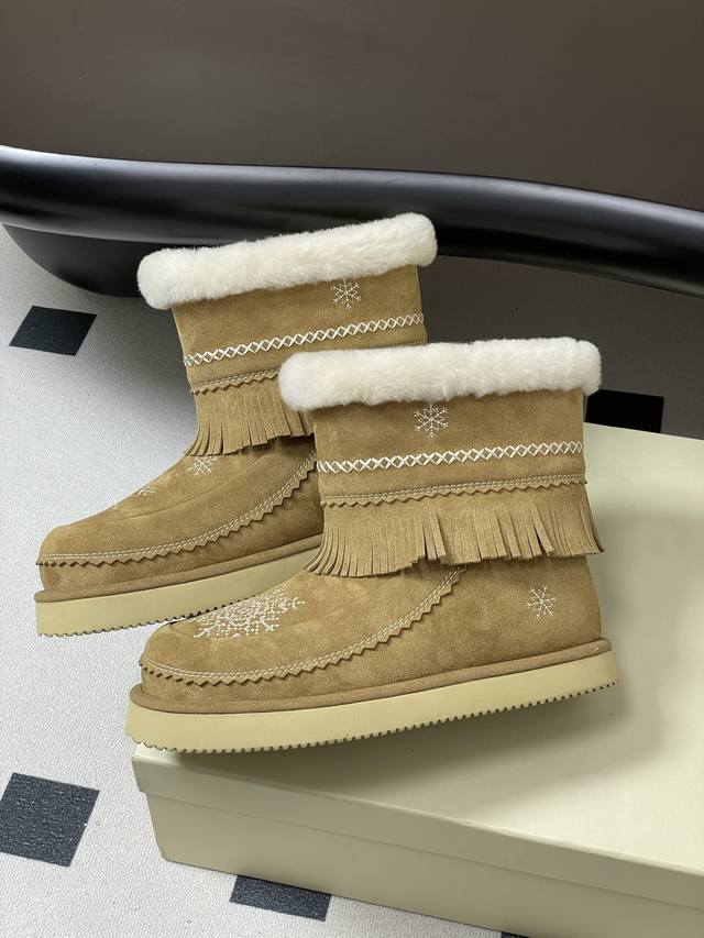小众品牌 Unfolio 25Fw秋冬新款 网红爆款流苏刺绣厚底短筒雪地靴羊毛短靴 DDD Lumi羊毛短靴推出浅卡其与深泰迪色两色,色调柔和,轻松适配冬日各类穿搭。鞋面采用绒面牛皮革,抗造且易清洁,日常打理省心,表面还点缀精细刺绣,呼应设计灵感中的冬日意象。内里是厚实羊毛材质,蓬松保暖性强,低温环境下能牢牢锁住脚部温度;靴型圆润饱满,包容更多脚型,兼顾舒适与利落感。鞋底为 DDD 2.5 厘米 Eva 发泡材质,大幅减轻脚部负担,长时间行走也不累;深纹路设计提升地面附着力,各类日常场景行走更安心,满足通