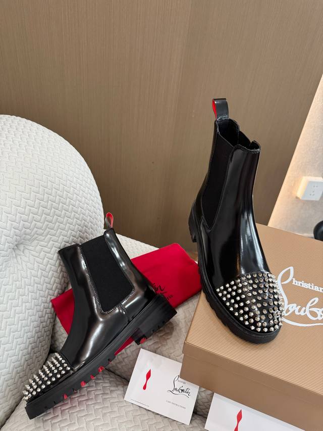 工厂P价 Christian Louboutin秋冬新品爆款. 上图转发必卖. 原版开发高品质专柜新品、原版套宣饱满帅气靴形、鞋头铆钉设计、配加顶级工艺双层黑红