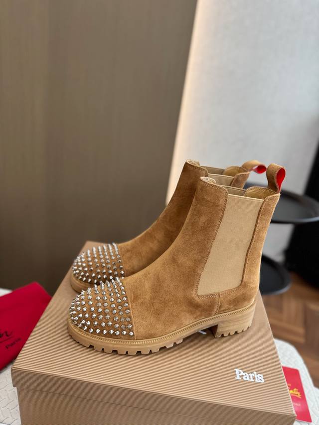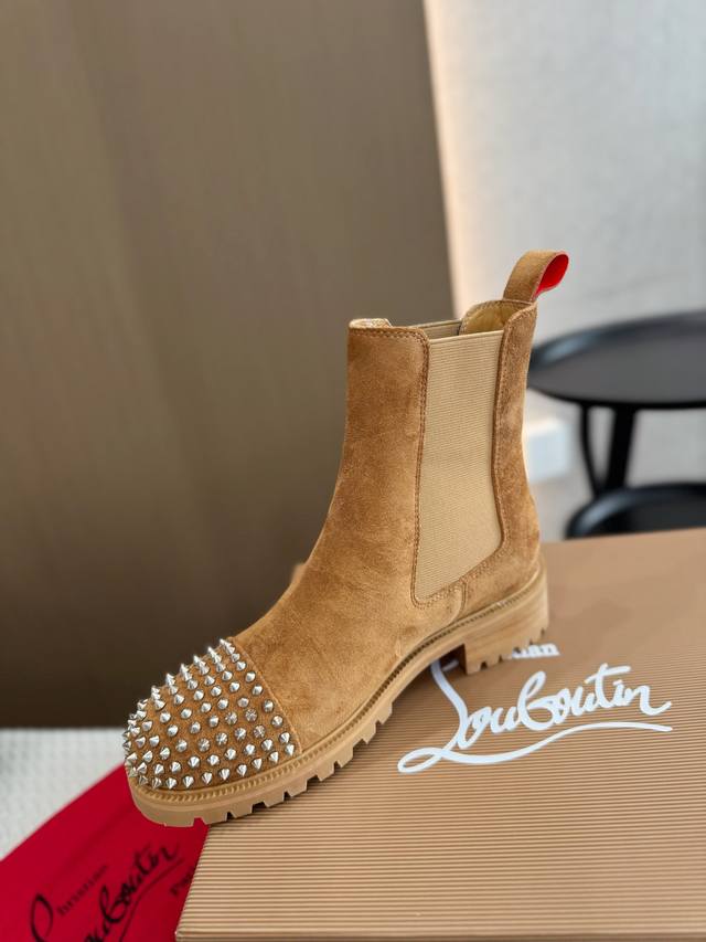 工厂P价 Christian Louboutin秋冬新品爆款. 上图转发必卖. 原版开发高品质专柜新品、原版套宣饱满帅气靴形、鞋头铆钉设计、配加顶级工艺双层黑红配色组合大底、色度光泽质感完全媲美正品、种种工艺加上明星上脚 名人街拍都是爆卖点、也是本厂强烈推荐的理由! 材质:进口牛绒皮面配电镀五金铆钉!内里垫脚全牛皮!顶级工艺不是一般工厂P可做到的组合双色橡胶大底、配置专柜原版包装 Szie: 35-40 41可订做