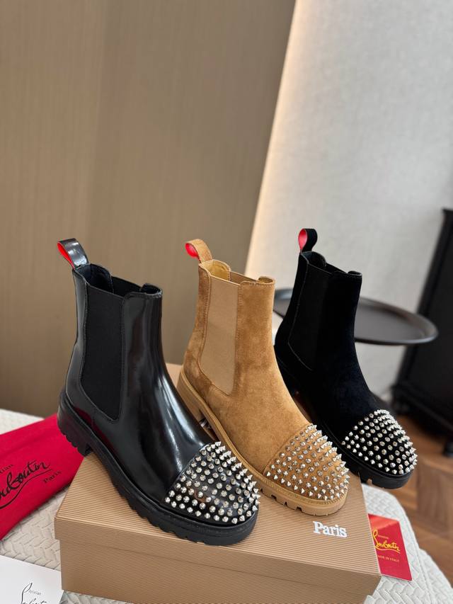 工厂P价 Christian Louboutin秋冬新品爆款. 上图转发必卖. 原版开发高品质专柜新品、原版套宣饱满帅气靴形、鞋头铆钉设计、配加顶级工艺双层黑红