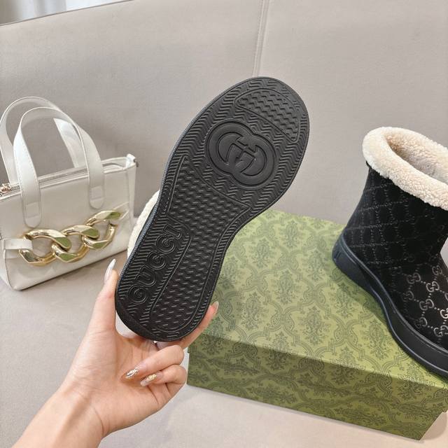 工厂p价 Gg 新款女士及踝靴羊毛靴这款 Cruise 靴子既稳定又奢华。Gg 图案和其他细节向品牌的根源致敬。 DDD 这款雪地靴鞋面采用牛皮反绒皮压纹Gg,内里羊毛一体,鞋垫采用塑料Q弹pu羊皮毛一体,脚感舒适又保暖,橡胶发泡大底防滑耐磨,码数35一42码, DDD