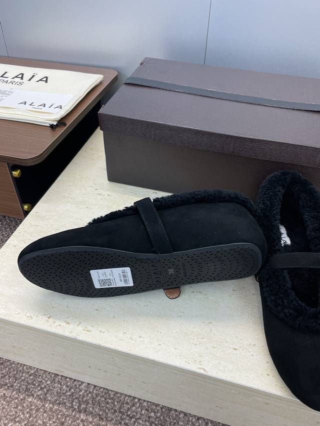 / 工厂p价p:普通盒 原版皮盒 阿莱亚2025秋冬新款羊羔毛玛丽珍芭蕾舞女鞋 Alaia明星同款平底圆头五金铆钉皮带扣拼色懒人乐福单鞋 材质:鞋面进口羊猄皮+羊羔