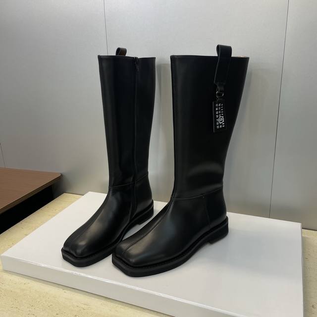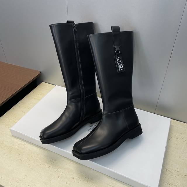 / 工厂p价p牛皮面p 牛猄面p510 Maison Margiela 马吉拉 2025秋冬新款一脚蹬高筒及膝女长靴 Mm6字母Logo低跟方头机车骑士靴 材质:鞋