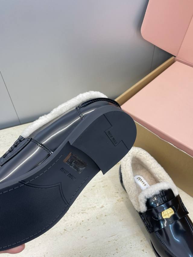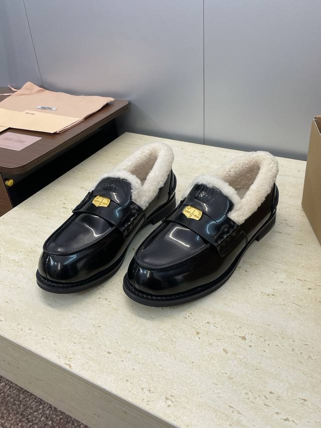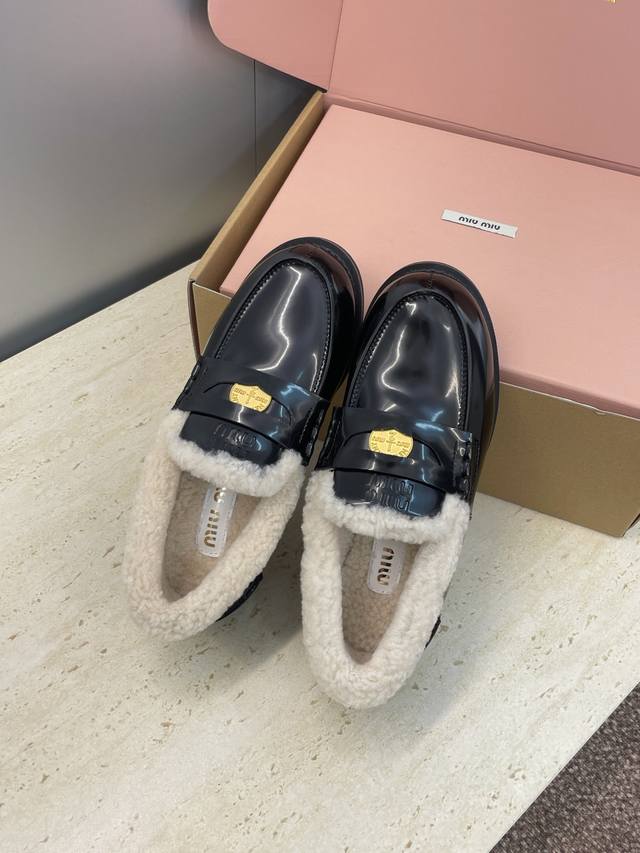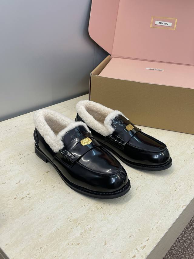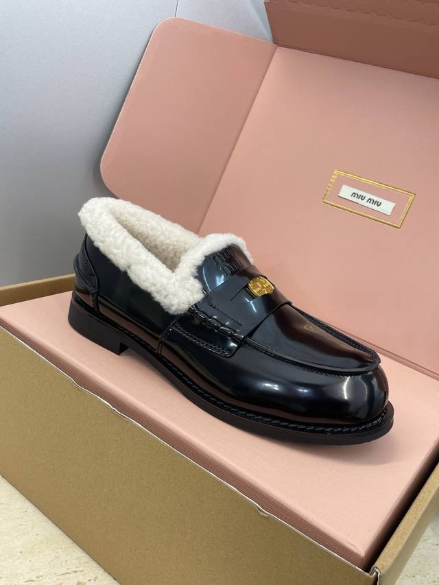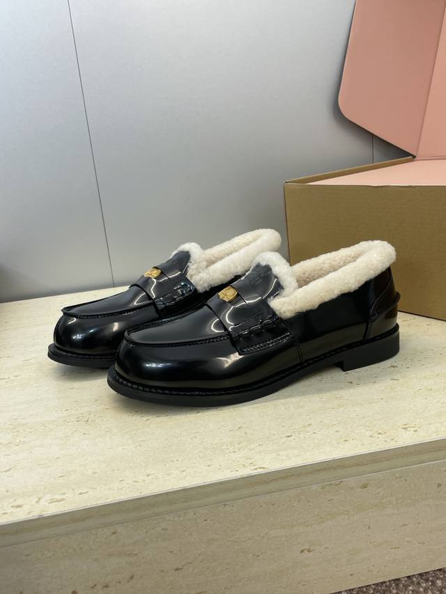 / 工厂p价p 配全套飞机盒 Miumiu 2025秋冬新款时尚羊羔毛女单鞋 缪缪字母Logo五金扣低跟圆头拼色乐福鞋 材质:鞋面进口牛猄皮 进口油蜡小牛皮 进口开