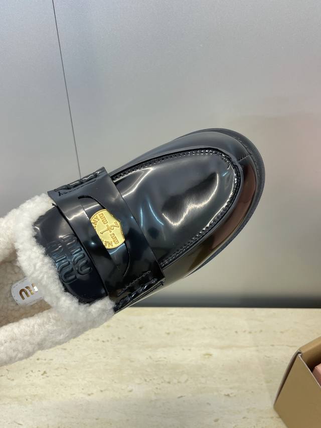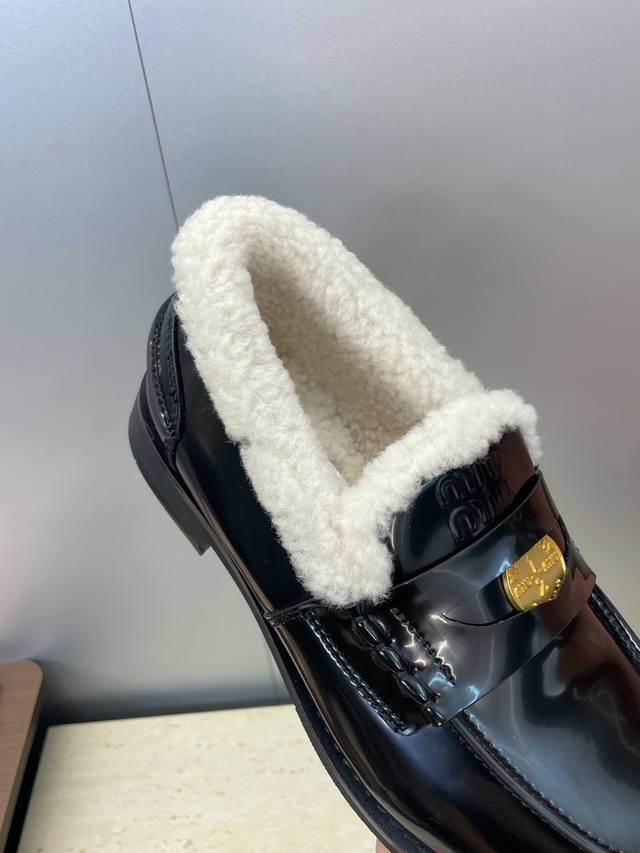 工厂p价p 配全套飞机盒 Miumiu 2025秋冬新款时尚羊羔毛女单鞋 缪缪字母Logo五金扣低跟圆头拼色乐福鞋 材质:鞋面进口牛猄皮 进口油蜡小牛皮 进口开
