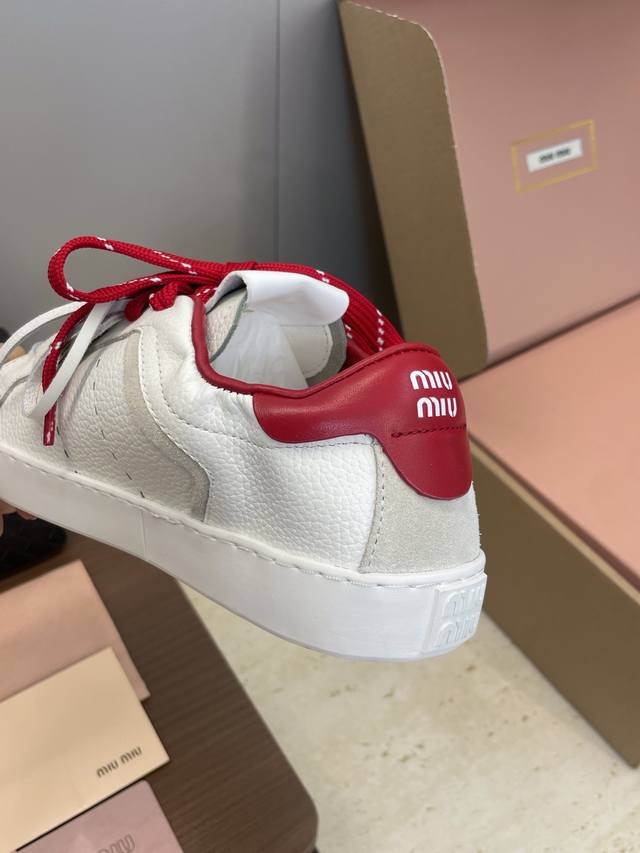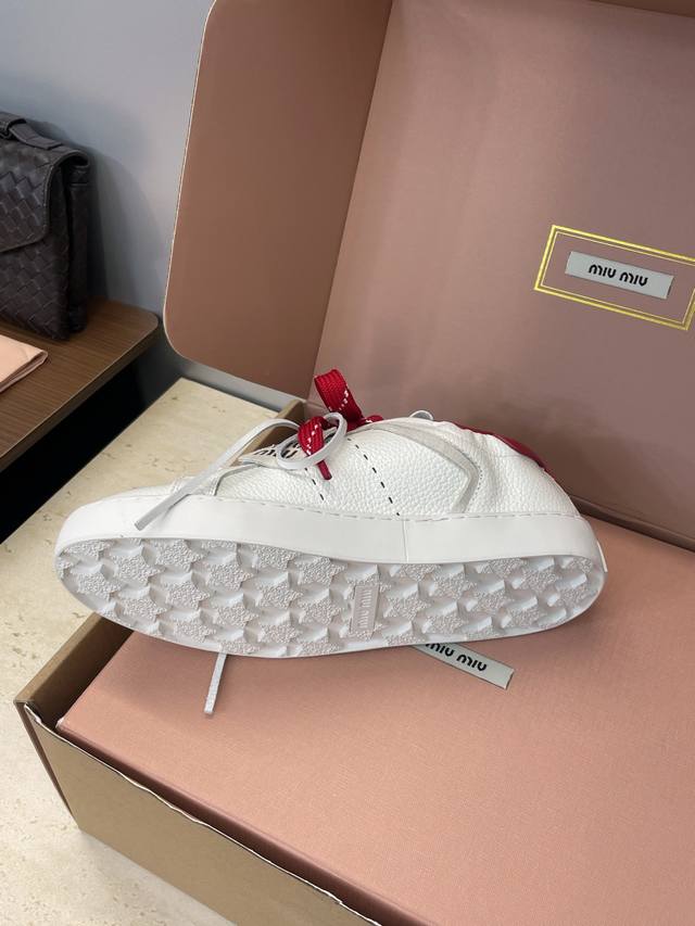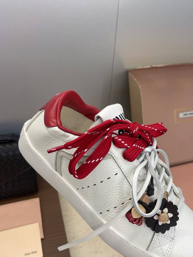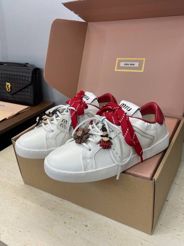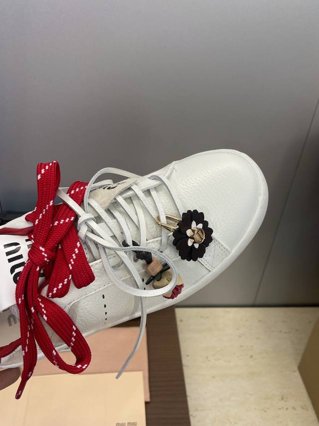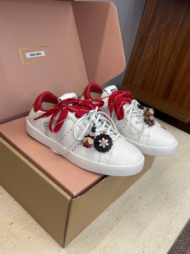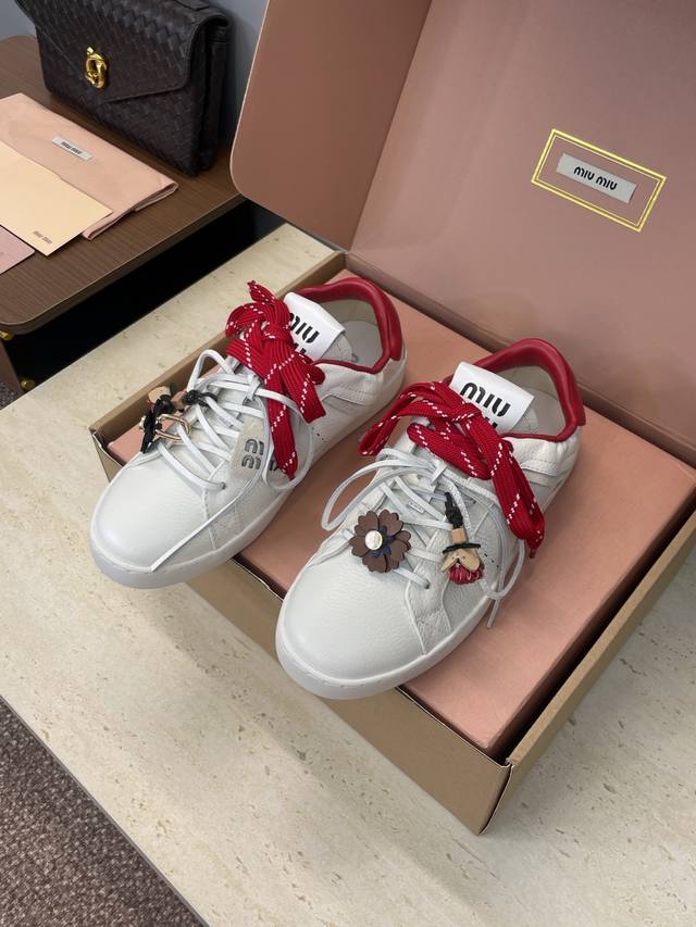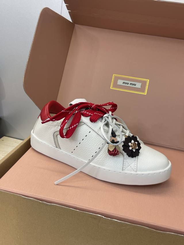 / 工厂P价P 配全套飞机盒 Miumiu 2025秋冬走秀新款高定系列拼色系带休闲运动小白鞋 缪缪明星同款字母Logo圆头花朵流苏滑板女鞋 材质:鞋面进口小牛皮+