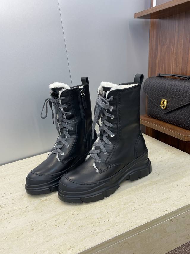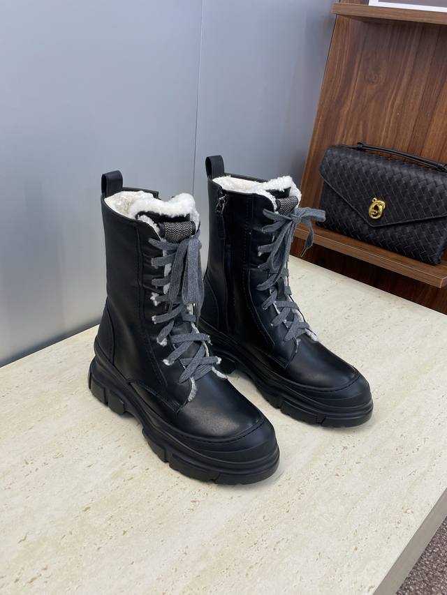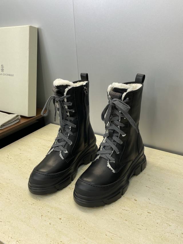 工厂p价p DDD Brunello Cucineli 布鲁内诺库奇内利2025秋冬新款羊羔毛防寒保暖雪地女短靴 Bc 厚底低跟圆头系带机车骑士军靴 DDD 材质:鞋面进口小牛皮 进口羊猄皮+羊羔毛内里+原版开模大底 DDD 跟高:3.5Cm DDD Size:35-39 40 41 42 定做不退换 DDD