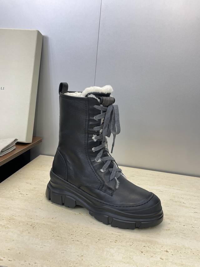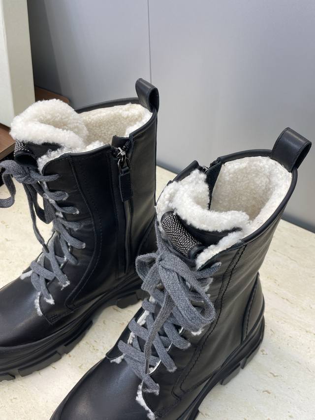 工厂p价p Brunello Cucineli 布鲁内诺库奇内利2025秋冬新款羊羔毛防寒保暖雪地女短靴 Bc 厚底低跟圆头系带机车骑士军靴 材质:鞋面进口小牛