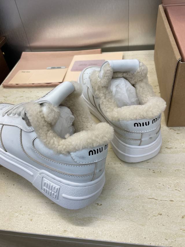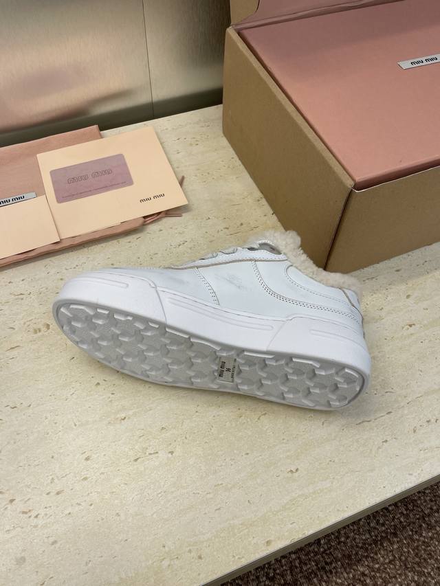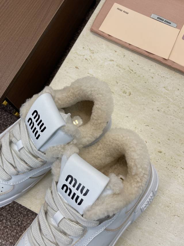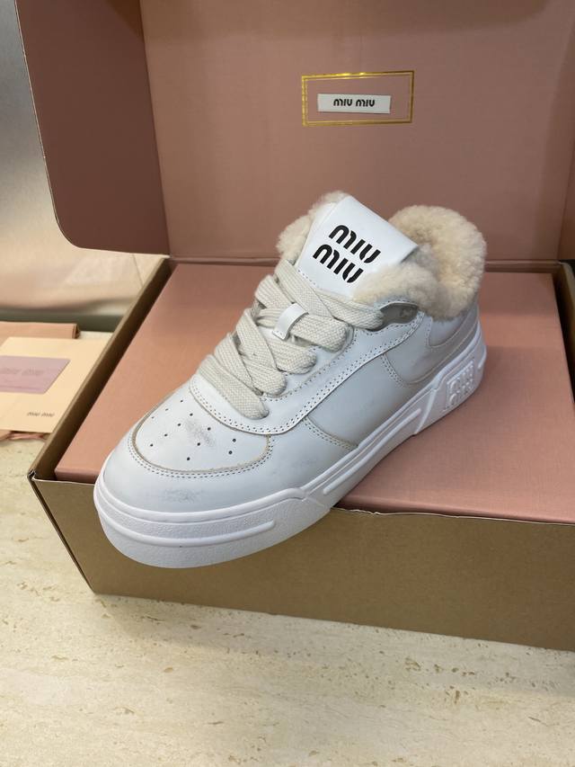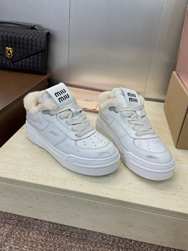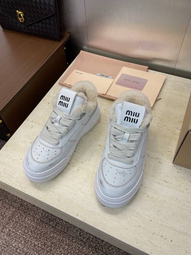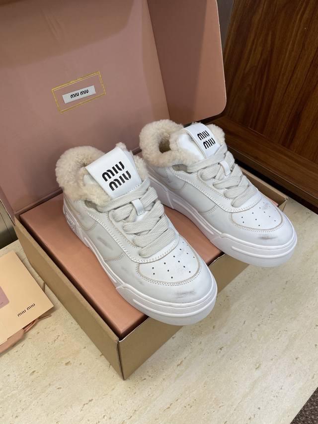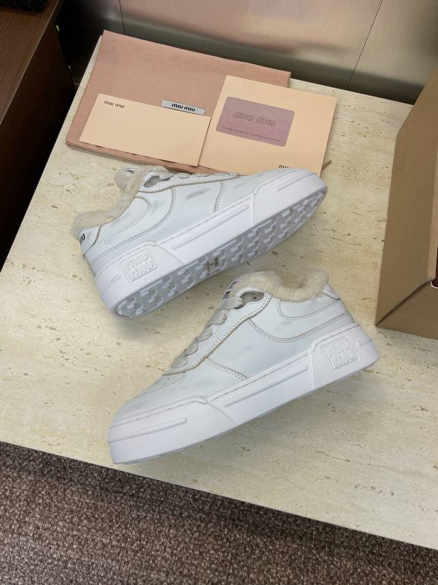 工厂P价P Miumiu 2025秋冬新款系列走秀新款系带休闲运动小白鞋 缪缪明星同款字母Logo厚底圆头擦色做旧防寒保暖羊羔毛滑板女鞋 材质:鞋面进口小牛皮+100%羊羔毛内里+原版开模大底 Size:35-41 40.41定制不退换