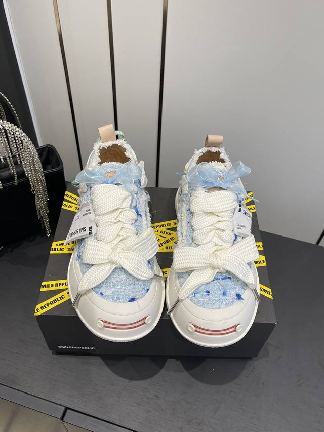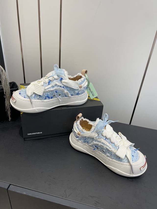 情侣款 DDD Smilerepublic 开口笑 帆布鞋 DDD 一款热度非常高的帆布鞋 最近各路明星网红纷纷上脚 太多综艺节目嘉宾穿Sr抢镜 美学理念初春充满艺术感的搭配 DDD 让这款 Smilerepublic帆布鞋瞬间成为春日爆款 也是明星们的心水好物 吸引力 Max DDD 是什么让这双帆布鞋火速出圈 羊毛流苏的设计大胆表达了先锋潮流加上可盐可甜的 蝴蝶结让整双鞋 拥有无限搭配风格的可能性 圆钝感加宽的鞋头设计 配合灵动的鞋型与缝线 完美地达到优化脚踝线条的效果 DDD 码数:女35-40 男