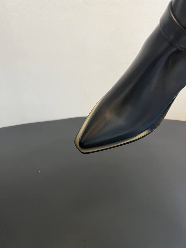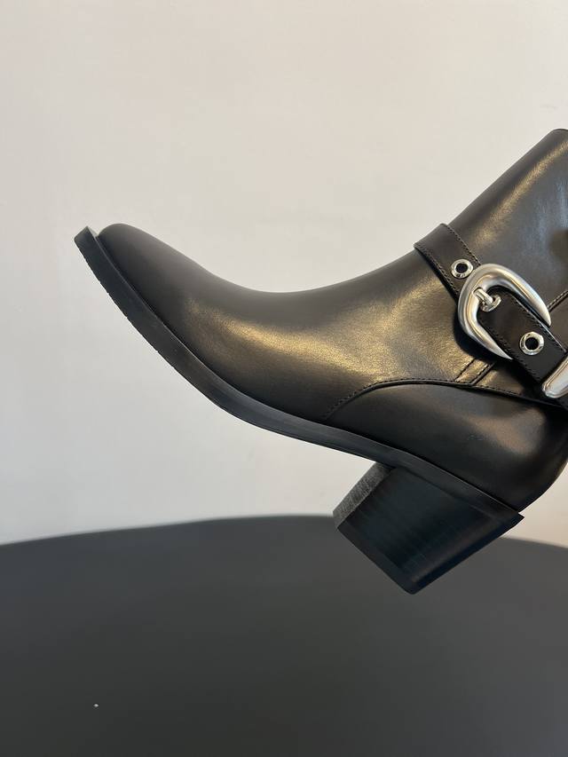 批牛京 牛皮 代购级 Sw 25复古摩登尖头短靴 采用质感细腻的驼色麂皮打造,触感柔软且富有复古韵味。金属扣带设计为点睛之笔,既具装饰性又能提升靴款的立体感,侧