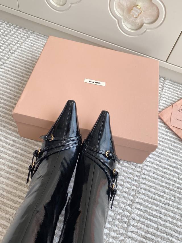 谬谬新出猫跟靴真的让人一整个心都融化 简约的带子设计增加了时尚感 鞋型整体都狠秀气!尖头设计拉长腿部线条,显得脚型超好看,交叉绑带的细节搭配上精致的金属圆环,既优雅又带着一丝小性感。