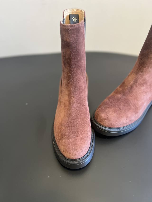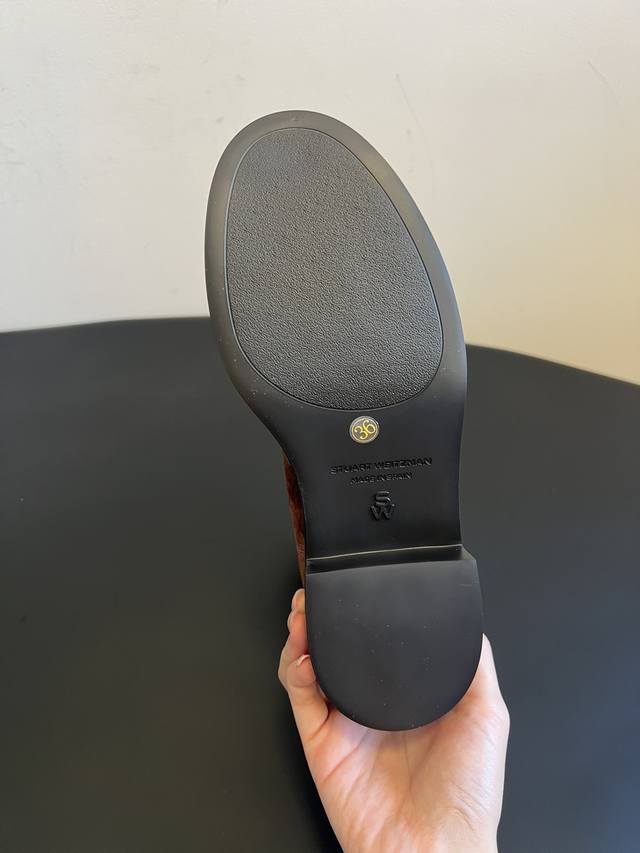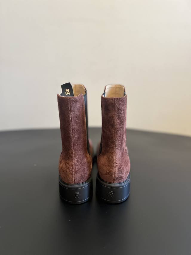 批绒面 牛皮 原厂级 Stuart Weitzma* Sw 5050切尔西靴短靴 有黑色光面皮革和棕红色麂皮两种材质选择,光面皮革质感细腻且富有光泽,麂皮材质则呈现出独特的绒面纹理,风格分别偏向经典干练与复古温暖。 经典切尔西靴款式,圆头设计贴合脚部轮廓,穿着舒适;低粗跟设计兼顾了舒适性与稳定性,适合日常长时间行走。弹性袜口设计方便穿脱,同时能贴合腿部线条。 材质:牛皮 牛反绒 内里:羊皮 大底:Ip发泡底 Size:35-40 40定制不退换