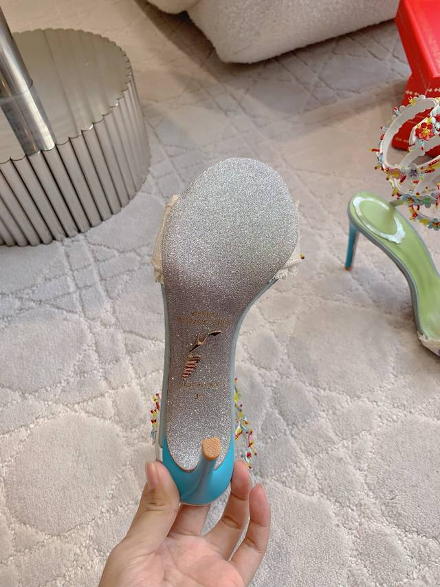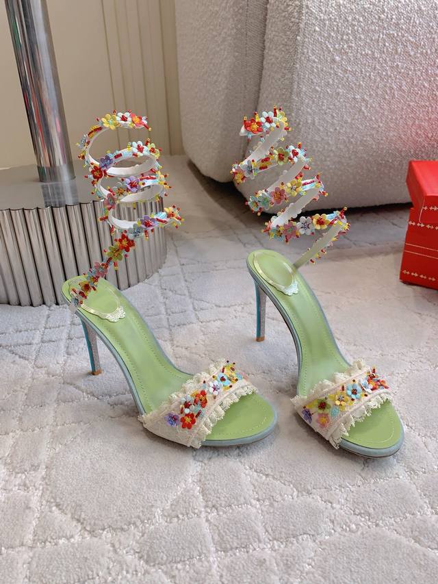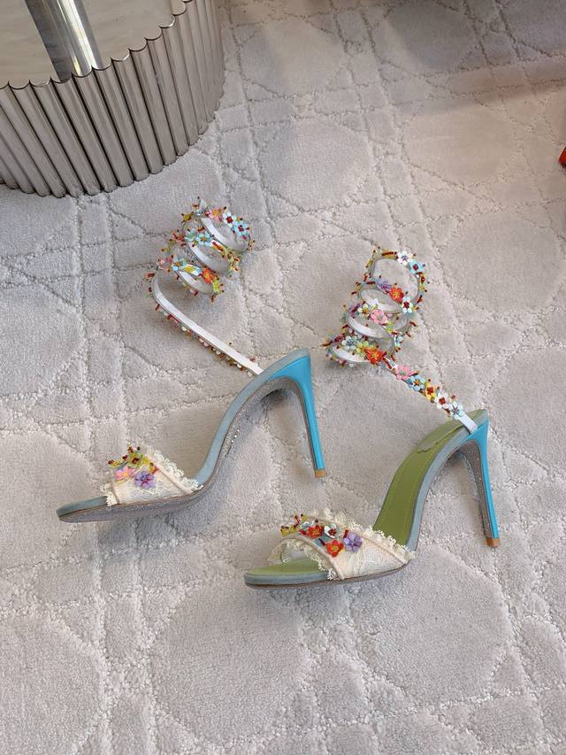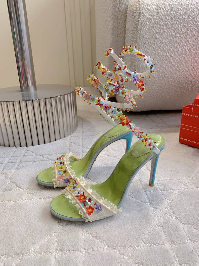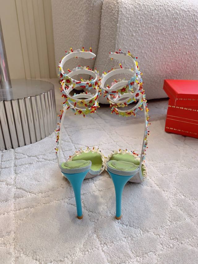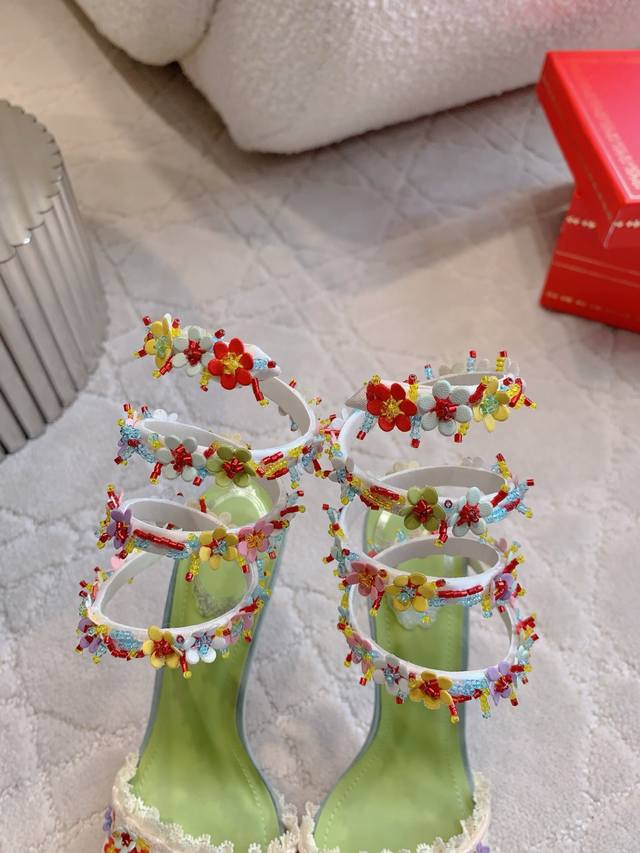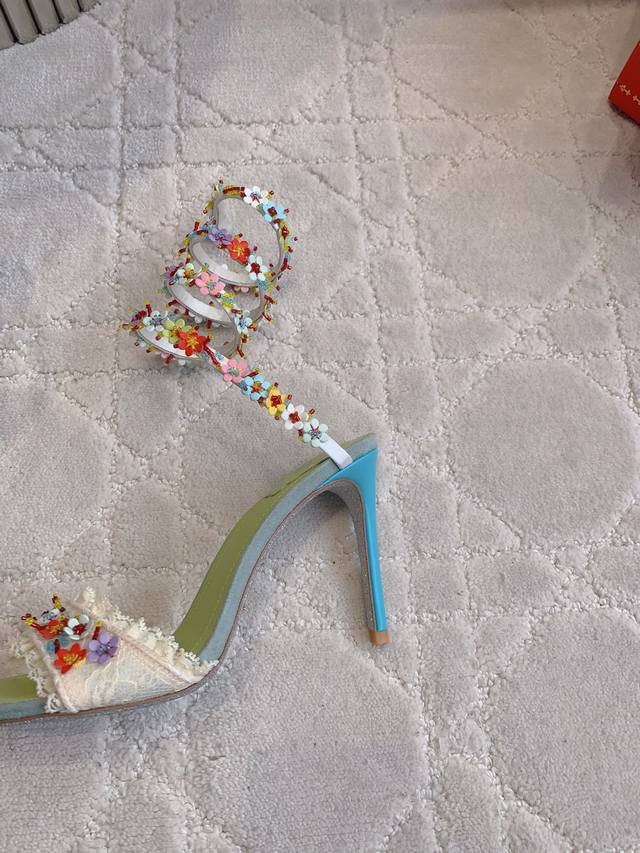 / 拖鞋 后带 蛇形 Ren* Caovill* 新款超重工繁花高跟鞋 纯手工缝制花朵 耗工耗时 精致奢华 鞋面透气网纱手工羊皮花朵 羊皮垫脚 原版闪面真皮大底 跟